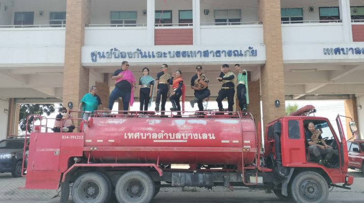เจ้าหน้าที่ ป้องกันและบรรเทาสาธารณะภัย เทศบาลตำบล บางเลน จ.นครปฐม สวมชุดไทย พร้อมประจำการอยู่บนรถ เพื่อปฎิบัติงาน และสร้างรอยยิ้มให้กับพนักงาน เป็นการทำงานให้มีความสุข