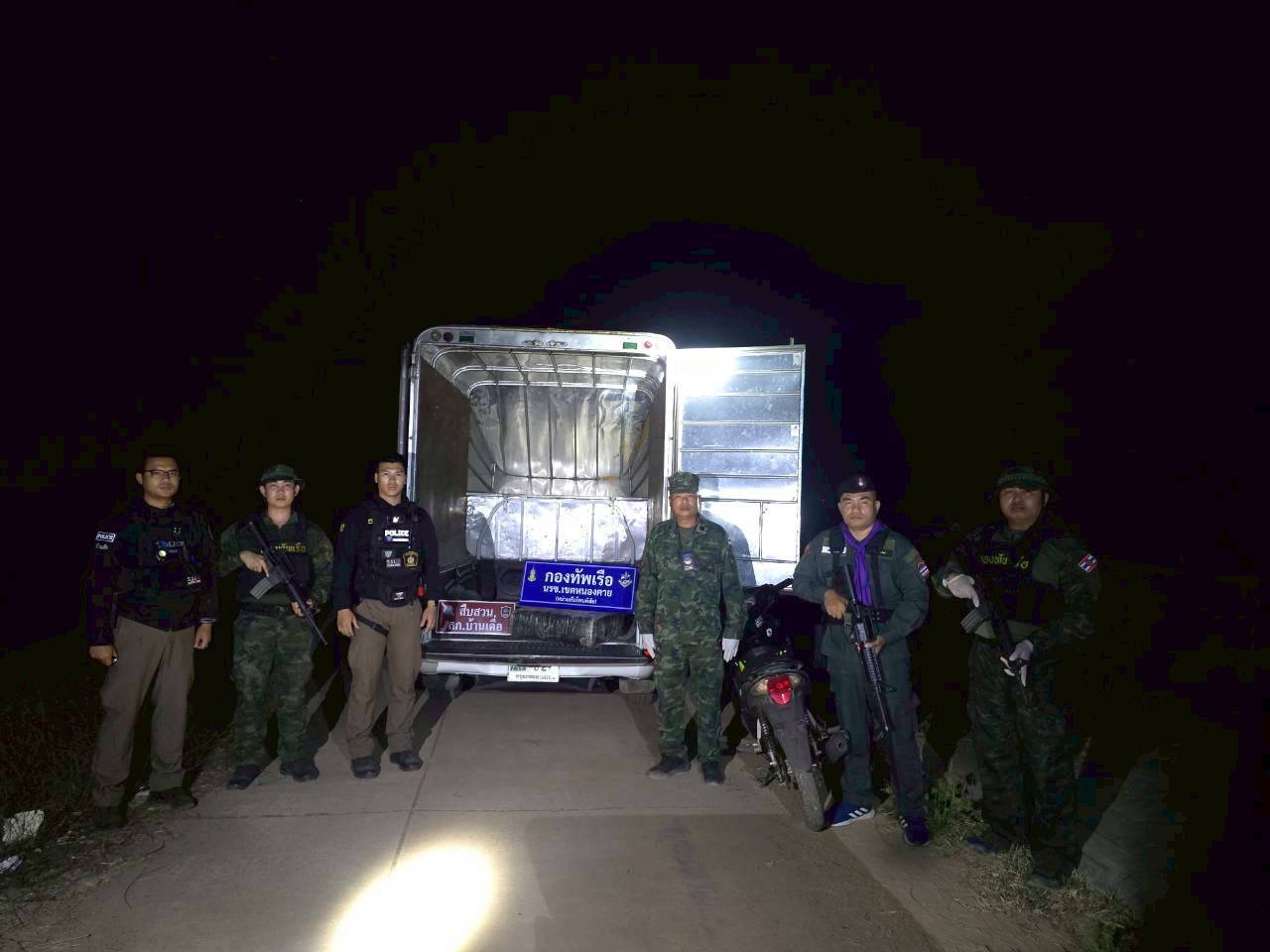 สืบเนื่องจากเมื่อวันที่ 10 ก.พ.69 เวลาประมาณ 10.00 น. พล.ร.ต.ณรงค์ เอมดี ได้รับแจ้งจากสายลับ ว่าจะมีการลักลอบนำยาเสพติดเข้ามาในพื้นที่ ต.บ้านเดื่อ อ.เมือง จ.หนองคาย จึงมอบหมายให้ น.อ.วิศิษฐ์พงศ์ เจริญวิชยเดช ผบ.นรข.เขตหนองคาย จัดชุดเฝ้าตรวจพื้นที่พร้อมสั่งการให้ ร.อ.ภาสพล สีทองเกตุ หน.นร.โพนพิสัย จัดชุดเฝ้าตรวจในพื้นที่ที่ได้รับแจ้ง จนกระทั่งเวลาประมาณ 00.45 น. ของวันที่ 11 ก.พ.69 ได้ตรวจพบเรือกีบ เพลายาว 1 ลำ มีบุคคลต้องสงสัยนั่งมาในเรือ 2 คน อยู่กลางลำแม่น้ำโขงห่างจากริมฝั่งไทยประมาณ 200 เมตร ดับเครื่องพายมุ่งหน้าตรงเข้ามายังฝั่งไทย ที่เขื่อนป้องกันตลิ่ง บริเวณหลังสถานีใบยาสูบปากสวย บ.ปากสวย ม.6 ต.บ้านเดื่อ อ.เมือง จ.หนองคาย ต่อมาได้มีรถจักรยานยนต์ 1 คัน แล่นเข้ามาจอดบริเวณเขื่อนป้องกันตลิ่งใกล้กับจุดที่เรือจอด จากนั้นก็มีรถยนต์ 1 คัน ขับเข้ามาจอดบริเวณเดียวกัน จนท.พบชายต้องสงสัย 2 คน กำลังช่วยกันแบกวัตถุต้องสงสัยมายังที่รถยนต์จอดอยู่ จนท.จึงได้แสดงตัวขอตรวจสอบ เมื่อทั้ง 2 คน เห็น จนท. ได้ทิ้งวัตถุต้องสงสัยแล้ววิ่งหนีกระโดดลงน้ำ 1 คน อีก1 คน ได้วิ่งเข้าไปในสวนเกษตรอาศัยความมืดหลบหนีไปได้