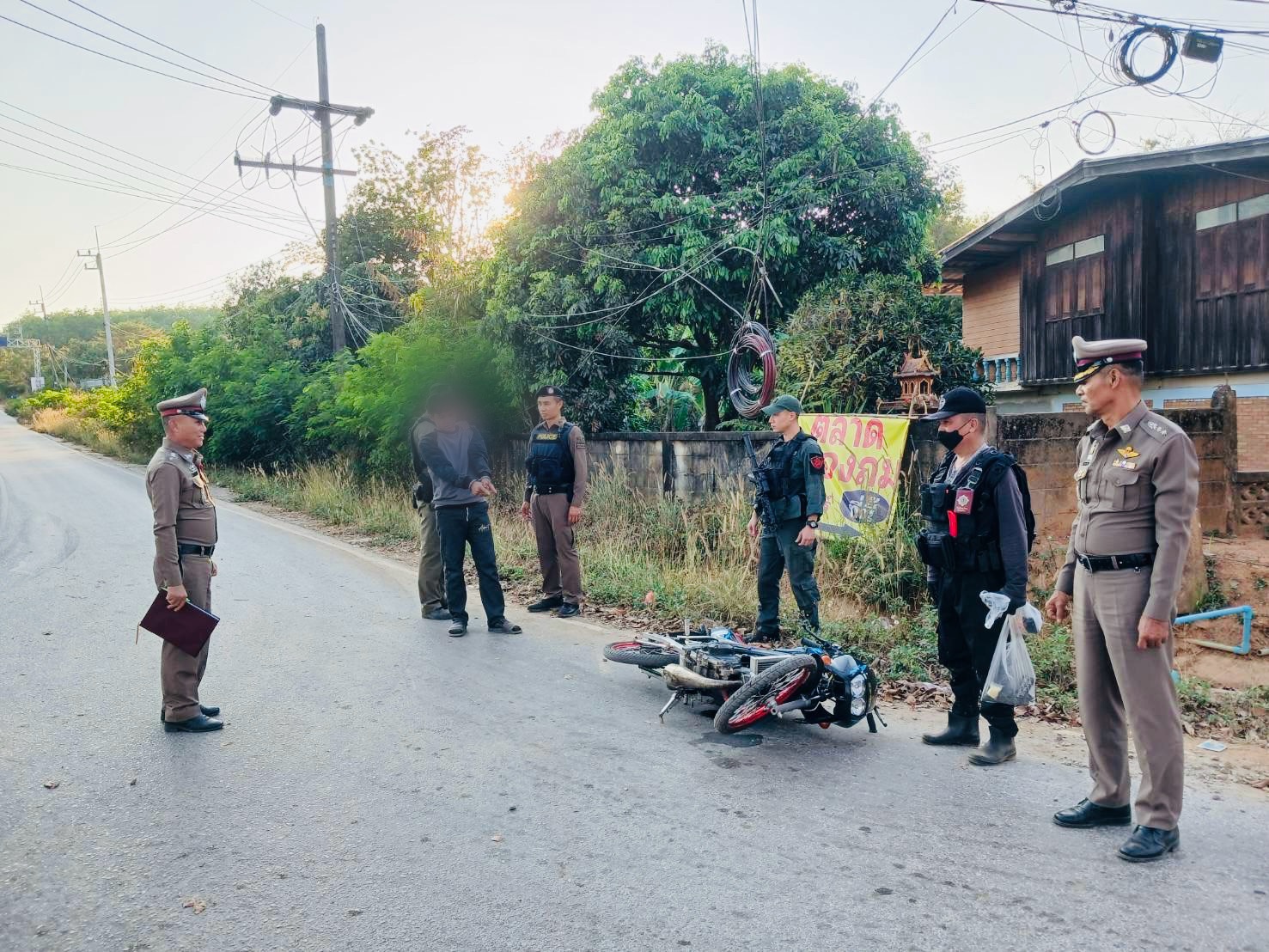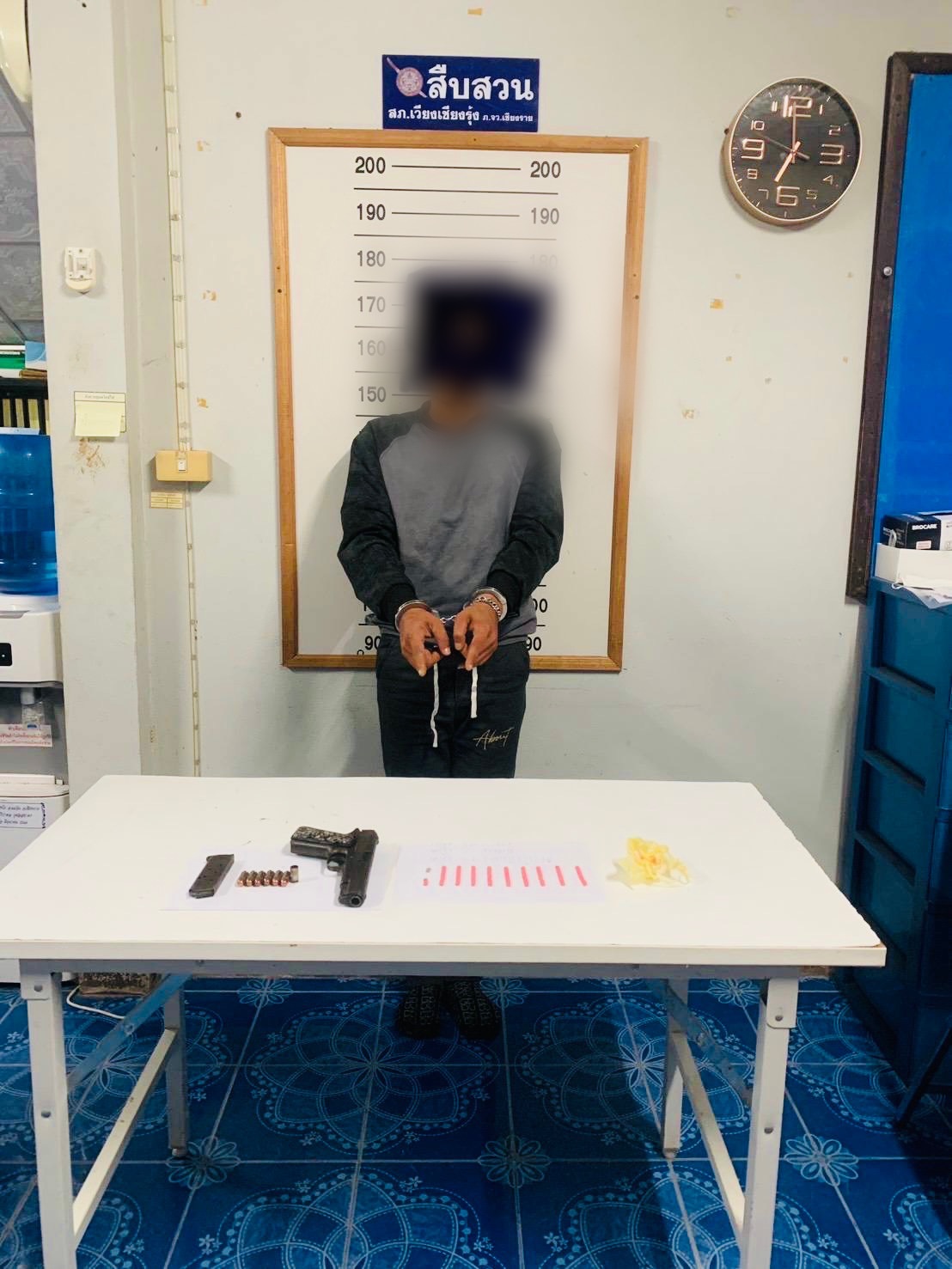 วันที่ 17 ก.พ.2569 พล.ต.ต.มานพ เสนากุล ผบก.ภ.จว.เชียงราย พ.ต.อ.สีหนาท นิลสุข ผกก.สภ.เวียงเชียงรุ้ง จ.เชียงราย สั่งการให้ พ.ต.ท.ยุทธกร ธรรมวงค์ รอง ผกก.สส.สภ.เวียงเชียงรุ้ง นำชุดสืบสวน ชุดสายตรวจและชุดจราจร ไประงับบุคคลที่มีอาการคลุ้มคลั่งคล้ายเมายาเสพติดบนถนนสายบ้านป่าเลา-บ้านร่องหวาย หมู่ 3 ต.ดงมหาวัน อ.เวียงเชียงรุ้ง เมื่อเจ้าหน้าที่ไปถึงพบนายทิน หรือ เอ็กซ์ ขับขี่รถจักรยานยนต์ยี่ห้อยามาฮ่า ไม่ติดแผ่นป้ายทะเบียน อยู่บนถนนสายดังกล่าวลักษณะตรงกับที่ได้รับแจ้ง เจ้าหน้าที่จึงได้แสดงตัวให้หยุดรถ แต่ปรากฏว่านายทิน ได้ทิ้งรถจักรยานยนต์แล้วได้วิ่งหลบหนีไปทางบ่อดินบ้านใหม่มหาวัน หมู่ 12 ต.ดงมหาวัน อ.เวียงเชียงรุ้ง จ.เชียงราย