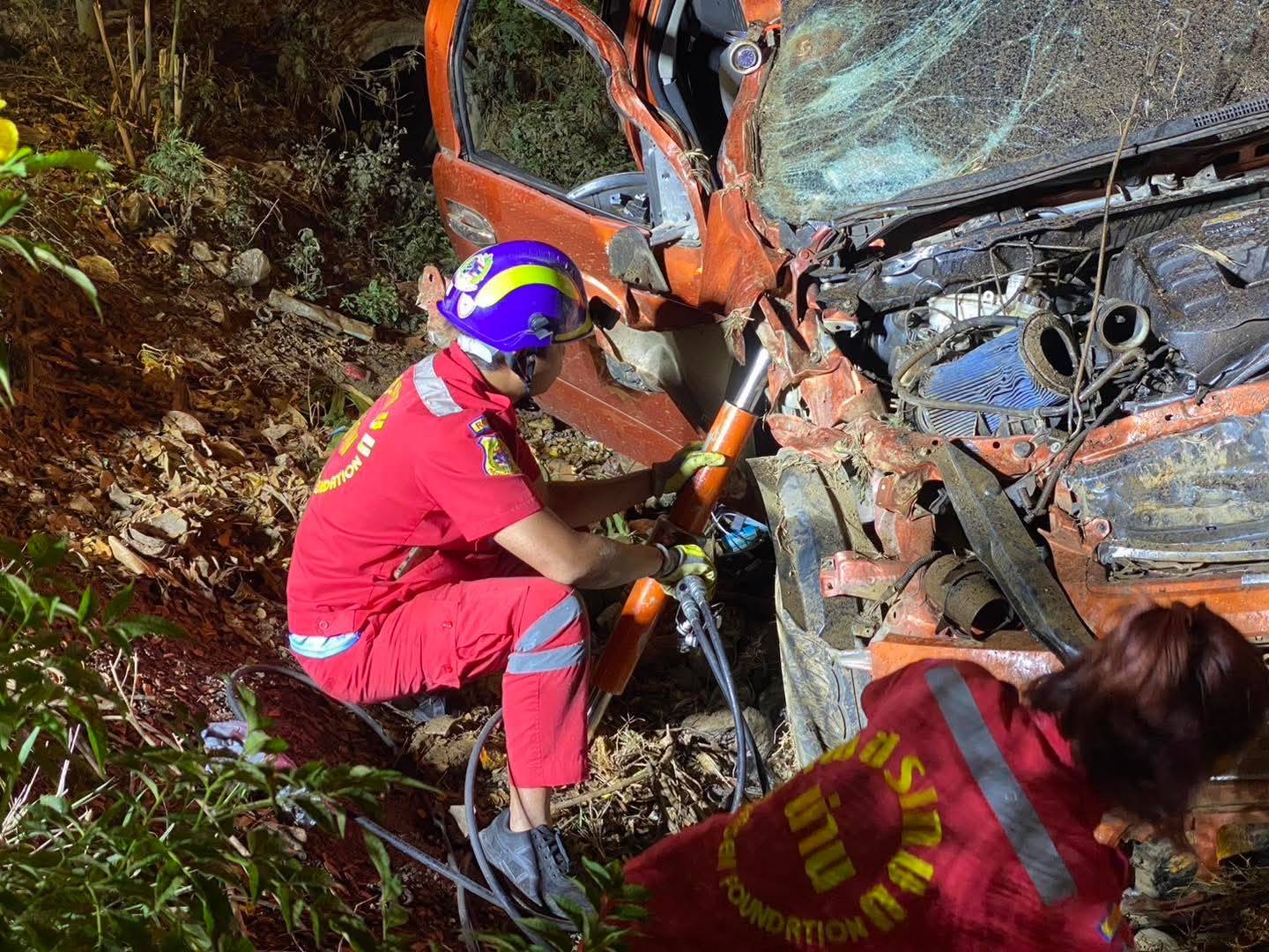 เจ้าหน้าที่กู้ภัยมูลนิธิเพชรเกษมน่าน และอาสากู้ชีพ อบต.ตาลชุม เร่งใช้อุปกรณ์ตัดถ่างนำร่างผู้เสียชีวิตออกจากตัวรถ ขณะที่ผู้บาดเจ็บ 2 ราย ได้รับการปฐมพยาบาลเบื้องต้น ณ จุดเกิดเหตุ ก่อนนำส่งรักษาต่อที่โรงพยาบาล โดยรถกู้ชีพ อบต.ตาลชุม และทีม ALS โรงพยาบาลท่าวังผา