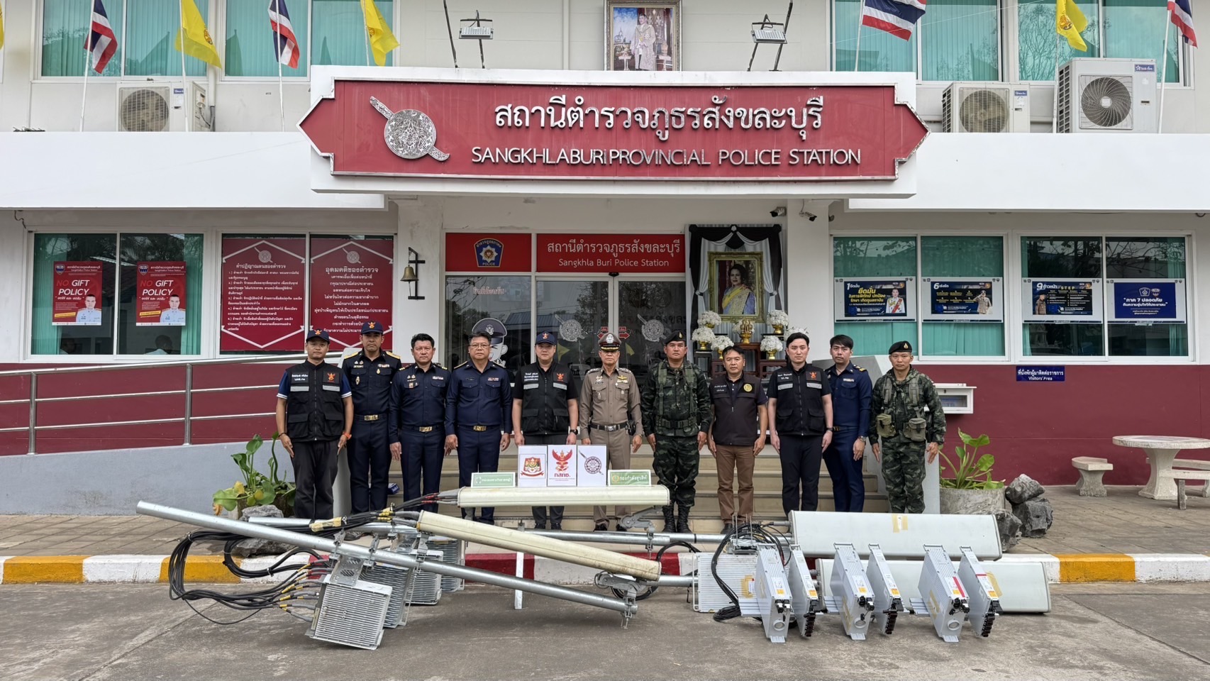 จึงสั่งการให้ พันเอก พรรณศักย์ เพรียวพานิช ผู้บังคับหน่วยเฉพาะกิจลาดหญ้า กองกำลังสุรสีห์ พร้อมด้วย พันเอก ปิยะเณศร์ ภัทรศาศวัตวงษ์ รองผู้บังคับหน่วยเฉพาะกิจลาดหญ้า ร่วมกับ นายวีรพนธ์ ศรีนวล รักษาการผู้อำนวยการสำนักงาน กสทช. ภาค 1, ฝ่ายปกครอง อ.สังขละบุรี และ สภ.สังขละบุรี ลงพื้นที่ตรวจสอบสถานีฐานโทรศัพท์เคลื่อนที่เอกชนรายหนึ่ง ในพื้นที่ ซอยเกษตร 8 ม.9 ต.หนองลู อ.สังขละบุรี จ.กาญจนบุรี ตามหมายค้นของศาลจังหวัดทองผาภูมิ พบสถานีฐานโทรศัพท์ปล่อยสัญญาณออกไปทางฝั่งประเทศเมียนมา จากการตรวจสอบ พบว่าสถานีฐานโทรศัพท์ดังกล่าว ดำเนินการจัดตั้งสถานีโดยไม่มีใบอนุญาตจากสำนักงาน กสทช. จึงได้ทำการตรวจยึดของกลางซึ่งประกอบด้วย เสาอากาศ จำนวน 4 ต้น, Remote Radio Unit จำนวน 6 Unit, Lithium- ion battery จำนวน 3 ตัว, Distribution power supply จำนวน 3 ตัว และสายนำสัญญาณจำนวนหนึ่ง ส่งพนักงานสอบสวน สภ.สังขละบุรี เพื่อดำเนินการตรวจสอบรายละเอียดทางเทคนิค และใช้เป็นพยานหลักฐานประกอบการสอบสวน และดำเนินคดีกับผู้ที่เกี่ยวข้องต่อไป