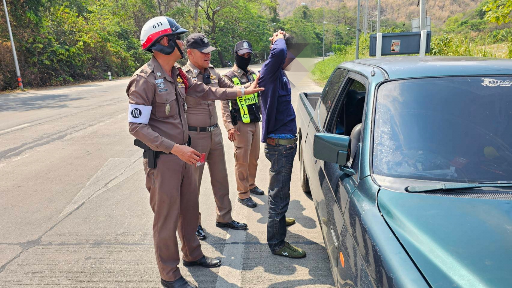 ตลอดเวลาการตั้งด่านไม่พบผู้กระทำผิดกฎหมายด้านการจราจร แต่มีบ้างบางรายที่เจ้าหน้าที่ได้ว่ากล่าวตักเตือนแล้วให้เดินทางต่อไปได้ จนกระทั่งเวลา 11.00 น.เจ้าหน้าที่พบรถยนต์กระบะยี่ห้อมิตซูบิชิ สตราดา สีเขียว ตอนเดียว หมายเลขทะเบียน กาญจนบุรี ขับมาจากทางด้านอำเภอด่านมะขามเตี้ย มุ่งเข้าตัวเมืองกาญจนบุรี ก่อนถึงด่านจราจรคนขับได้ชะลอคล้ายจะกลับรถเพื่อวนกลับ เจ้าหน้าที่จึงส่งสัญญาณเรียกเพื่อขอตรวจสอบเอกสารตามปกติ