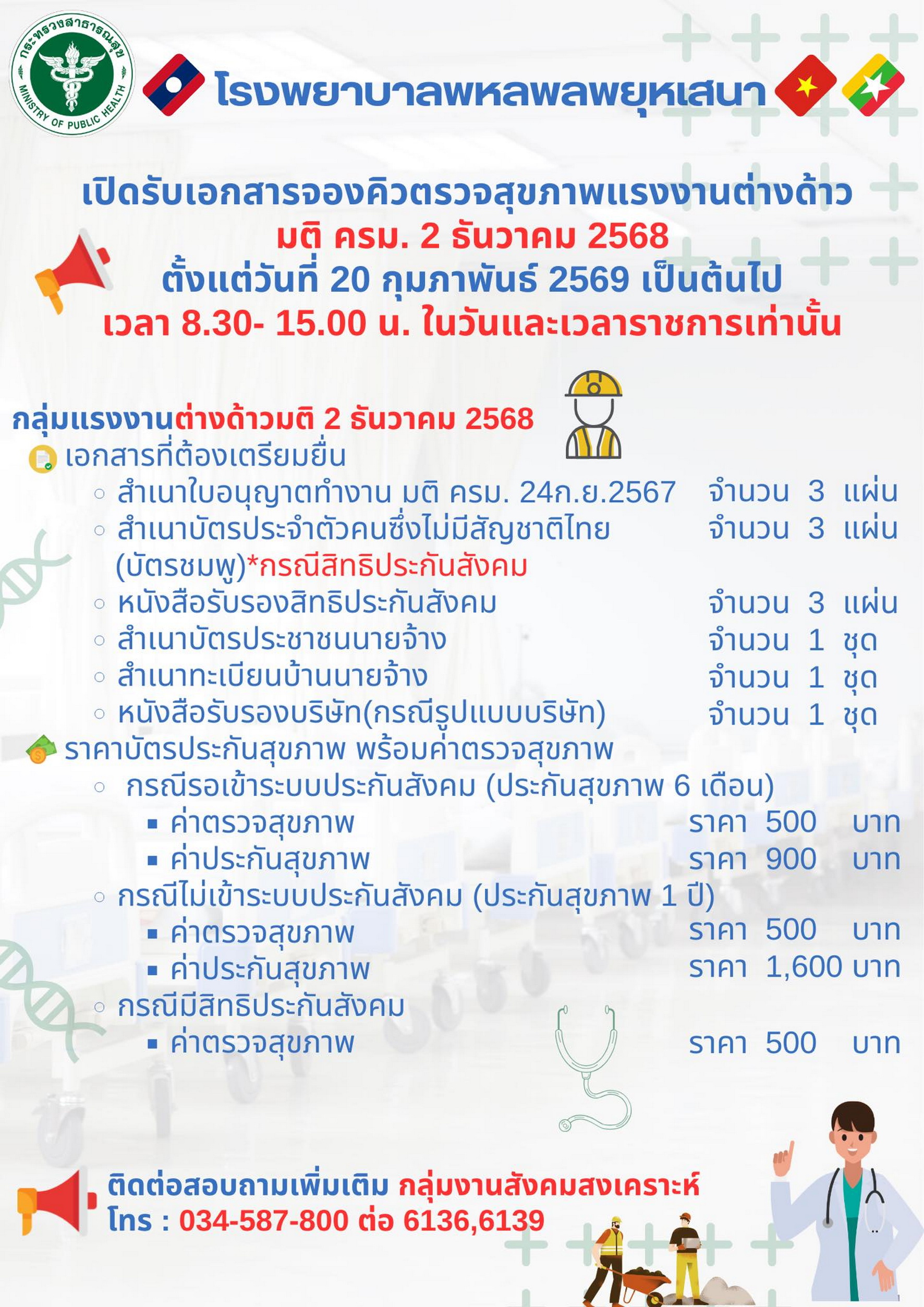 ล่าสุด โรงพยาบาลพหลพลพยุหเสนา จ.กาญจนบุรี ได้ประชาสัมพันธ์ผ่านเพจโรงพยาบาลฯ ว่า โรงพยาบาลฯเปิดรับเอกสาร จองคิวตรวจสุขภาพแรงงานต่างด้าวตามมติคณะรัฐมนตรี วันที่ 2 ธันวาคม 2568 ตั้งแต่วันนี้ ถึงวันที่ 31 มีนาคม 2569 เวลา 08.30-15.00 น. เฉพาะวันและเวลาราชการ