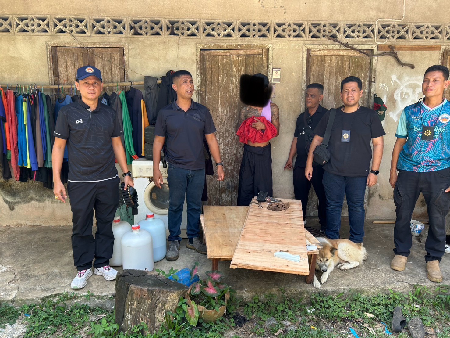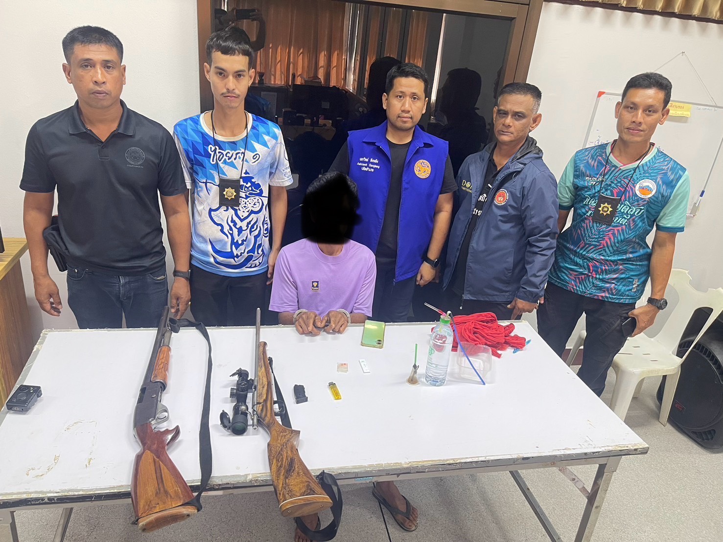 จากการสืบสวนและเข้าตรวจสอบ พบชายต้องสงสัยมีพฤติกรรมตามที่ได้รับแจ้ง เจ้าหน้าที่จึงแสดงตัวเข้าตรวจค้นและจับกุม นายไพจิตร (สงวนนามสกุล) อายุ 46 ปี พร้อมของกลางประกอบด้วยยาเสพติดให้โทษประเภท 1 เมทแอมเฟตามีน (ยาบ้า) จำนวน 2 เม็ด พร้อมอุปกรณ์การเสพยาเสพติด อาวุธปืนลูกซอง ขนาด 12 จำนวน 1 กระบอก เครื่องกระสุนปืน ขนาด 12 จำนวน 10 นัด อาวุธปืนเดี่ยวลูกกรด ขนาด .22 จำนวน 1