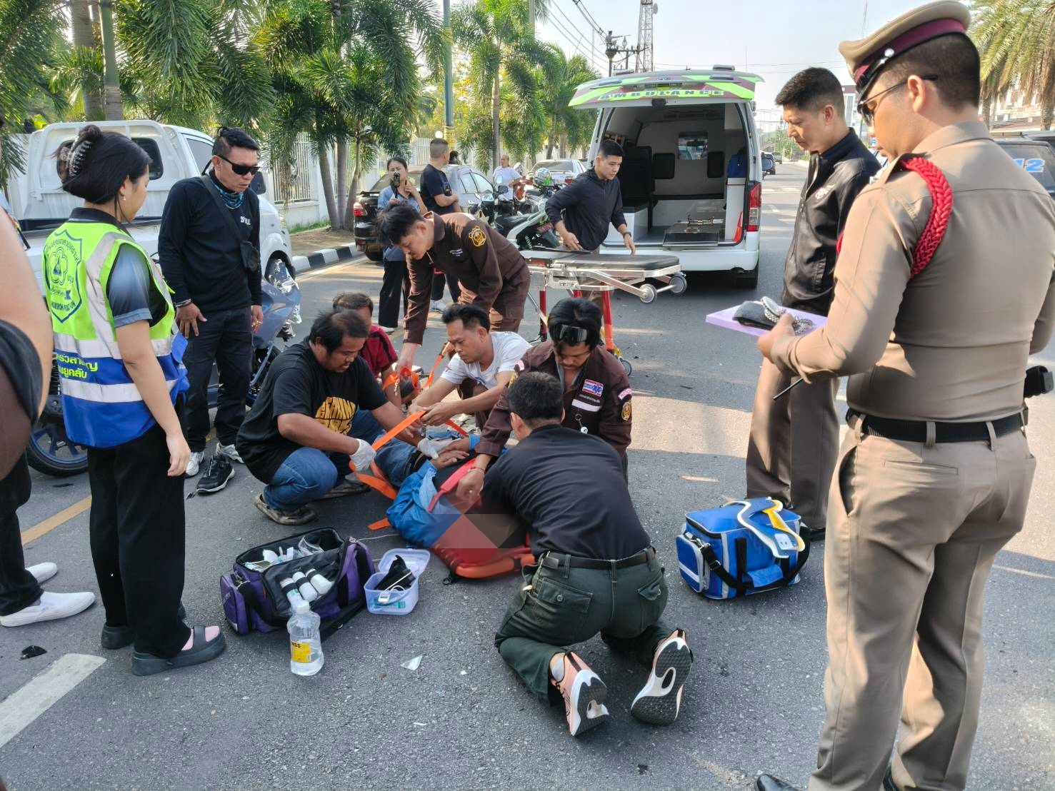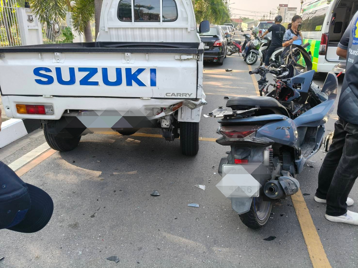 ที่เกิดเหตุ พบรถกระบะซูซูกิ สีขาว ทะเบียน กทม จอดอยู่ถนนเรนซ้าย ริมฟุตบาท ที่กระบะท้าย ด้านขวามีรอยเฉียวชน และ พบรถจักรยานยนต์ honda PCX สีเทาทะเบียน นครปฐม สภาพ พังยับเยิน ทั้งคัน ข้างรถจยย.พบนายกิตติศักดิ์ อายุ 58 ปีอยู่ หมู่ 3 ต.คลองจินดาอ.สามพราน จ.นครปฐมนอนคว่ำหน้า อยู่กลางถนน ที่หัวโนปูดบวม แขนซ้ายหัก ฟกช้ำตาม ลำตัวนอนหายใจรวยรินถามตอบไม่ได้ เจ้าหน้าที่จึงช่วยกัน ปฐมพยาบาลทำตัว และสั่งการให้เร่งนำตัวส่งโรงพยาบาลสามพราน เพื่อยื้อชีวิตต่อไป