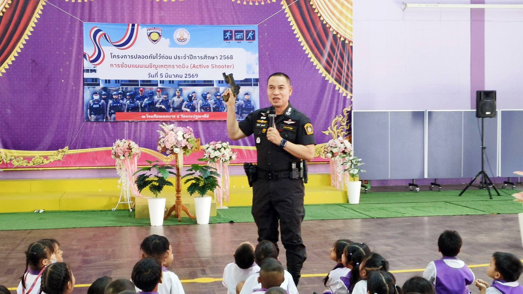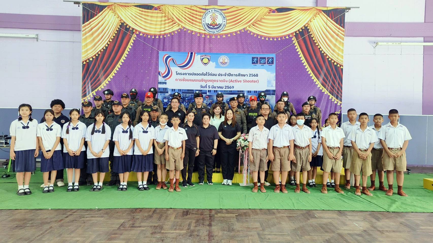 ” ตำรวจเมืองนครปฐม เสริมทักษะ นร.เอาตัวรอดเมื่อเกิดเหตุรุนแรงในสถานศึกษา “ หนี – ซ่อน – สู้ (เงียบ) อย่างปลอดภัย “ & ซ้อมแผนเผชิญเหตุรับมือโจรปล้นทอง