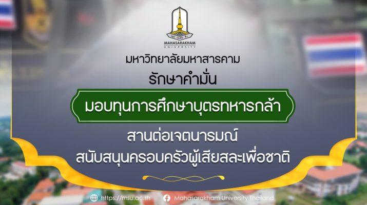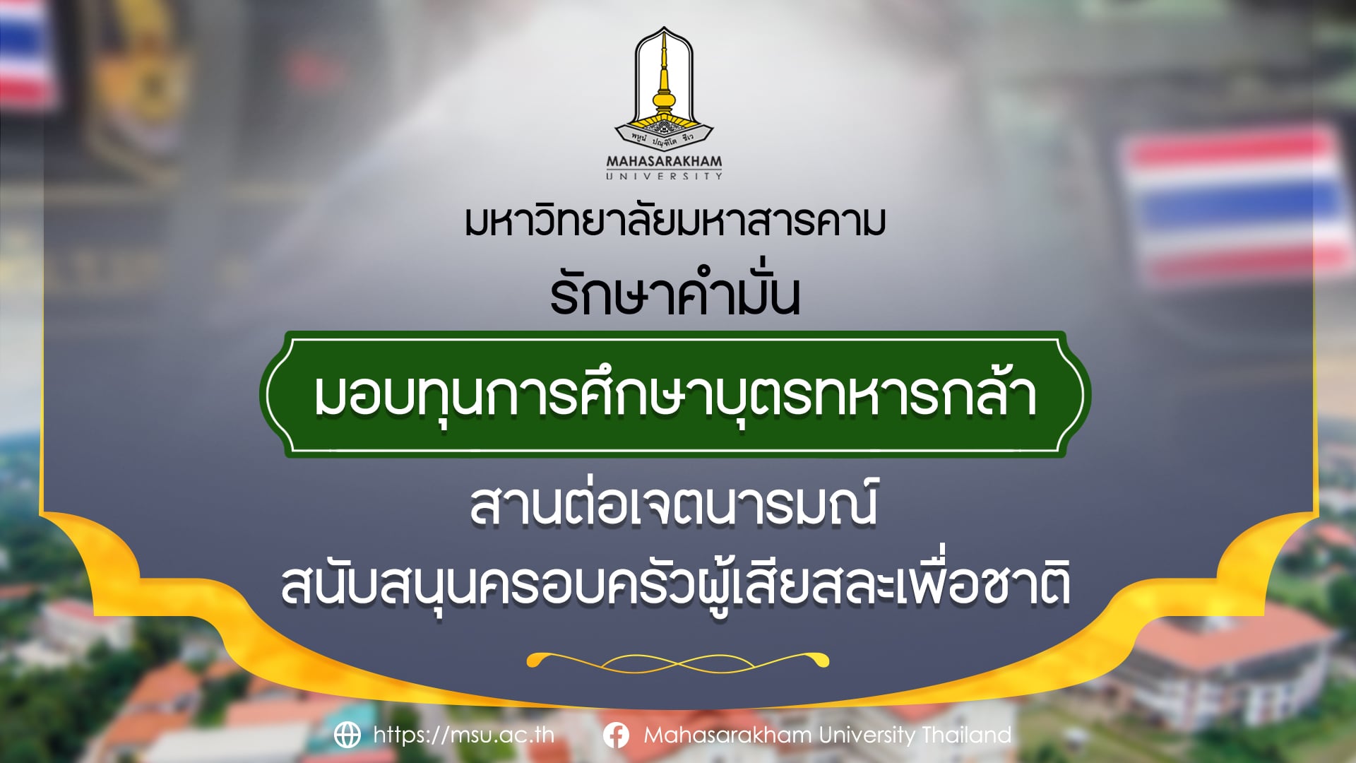 มหาวิทยาลัยมหาสารคาม (มมส) ตอกย้ำนโยบายด้านความรับผิดชอบต่อสังคม เดินหน้ามอบทุนการศึกษาแก่บุตรทหารที่ได้รับบาดเจ็บจากการปฏิบัติหน้าที่ชายแดนไทย-กัมพูชา ยกเว้นค่าธรรมเนียมการศึกษาตลอดหลักสูตร มุ่งหวังสร้างโอกาสและแบ่งเบาภาระครอบครัวรั้วของชาติ