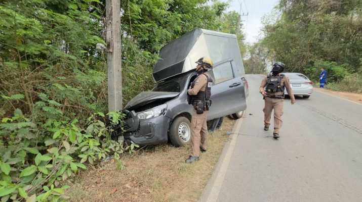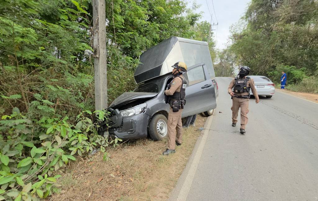 พบรถยนต์กระบะตู้ทึบ ยี่ห้อ Toyota สีเทา/ดำ ทะเบียน น่าน สภาพด้านหน้าฝั่งคนขับชนกับเสาไฟฟ้าแรงสูงจนพังเสียหาย ไม่สามารถขับเคลื่อนได้ อย่างไรก็ตามทรัพย์สินทางราชการไม่ได้รับความเสียหาย