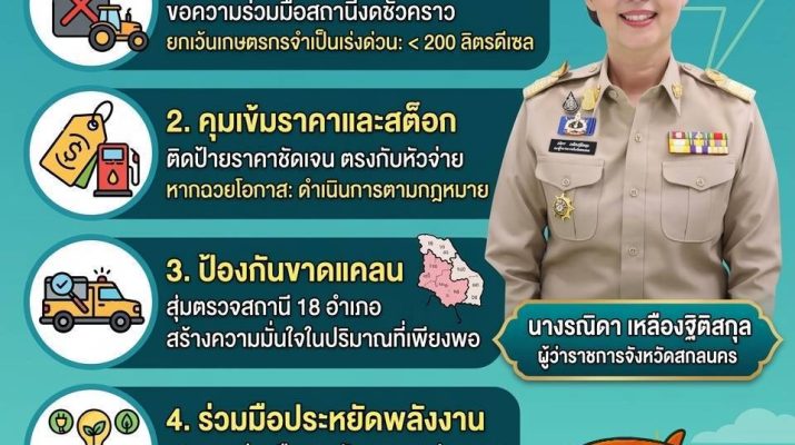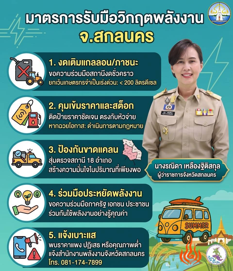 นาง รณิดา เหลืองฐิติสกุล ผวจ.สกลนคร คุมเข้มสั่งการเชิงรุก ให้ตรวจเข้มปั๊มน้ำมันทั่วจังหวัด 18 อำเภอ เพื่อความมั่นใจของพี่น้องประชาชนว่าผู้ประกอบการจะไม่ฉวยโอกาสกักตุน ,ขึ้นราคา พร้อมเน้นย้ำงดเติมใส่แกลลอน (ป้องกันกักตุน) ยกเว้นพี่น้องเกษตรกรเติมใส่แกลลอนได้ไม่เกิน 200 ลิตร นอกจากนี้ยังให้ตรวจสอบ ราคากับหัวจ่ายต้องตรงกัน ห้ามปฏิเสธการขายเด็ดขาด ขอให้ร่วมใจ ช่วยกันประหยัดพลังงาน เพื่อความมั่นคงของบ้านเรา หากพบเห็นสิ่งผิดปกติ หรือน้ำมันไม่ได้คุณภาพ