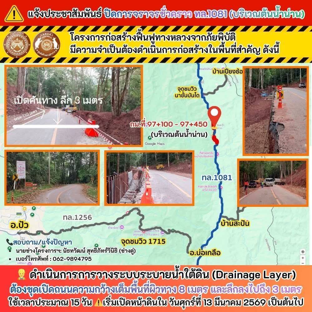 ทางหลวงหมายเลข 1081 ช่วง กม.97+100 – 97+450 (บริเวณต้นน้ำน่าน) ถนนสายนี้เป็นเส้นทางสำคัญที่เชื่อมระหว่างอำเภอปัว-อำเภอบ่อเกลือ