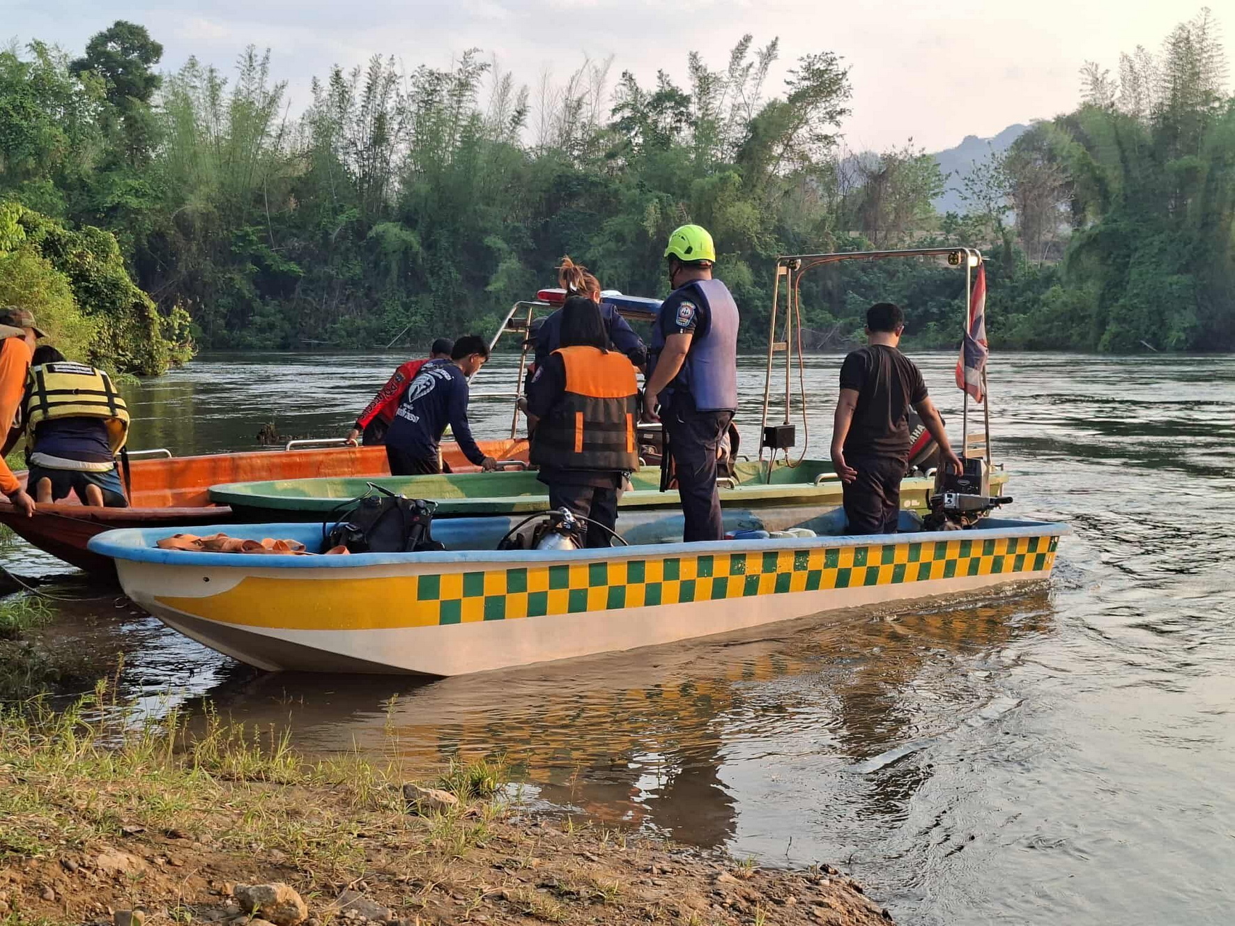 จากกระแสน้ำที่ไหลเชี่ยวรุนแรง จึงประสานไปยังอาสาสมัครมูลนิธิพิทักษ์กาญจน์ จัดทีมประดาน้ำเข้าร่วมในการค้นหาผู้สูญหายดังกล่าวตลอดทั้งวัน และเวลาค่ำเจ้าหน้าที่จึงจำเป็นต้องยุติการค้นหา เนื่องจากสภาพอากาศเริ่มมืดและไม่อำนวยต่อการค้นหาเพราะกระแสน้ำไหลเชี่ยว และบริเวณใต้น้ำมีโขดหินเป็นจำนวนมาก จึงทำให้ยากต่อการค้นหา