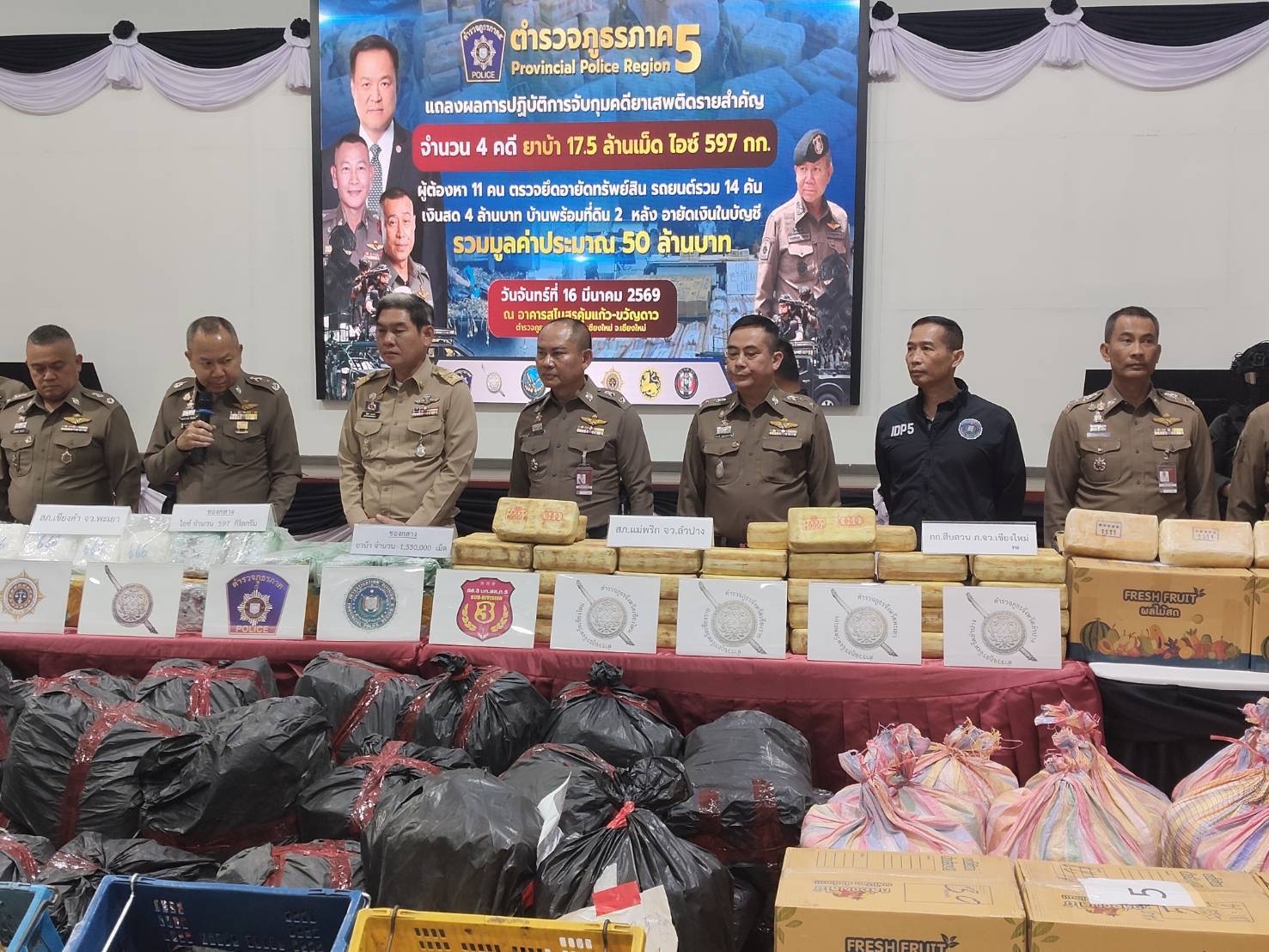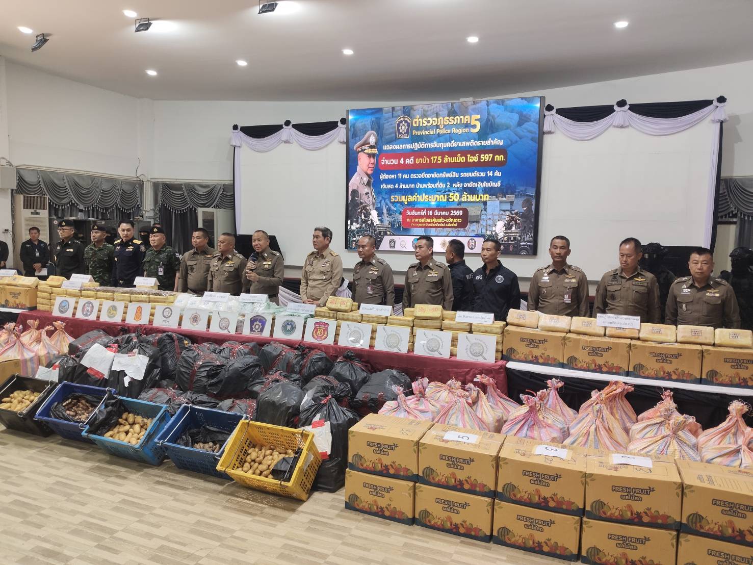 ภาค 5 ร่วม นบ.ยส.35 ปปส. และฝ่ายปกครอง จับยาเสพติด 4 คดียึดยาบ้า 17.5 ล้านเม็ด ไอซ์ 597 กก. อายัดทรัพย์ 50 ล้านบาท