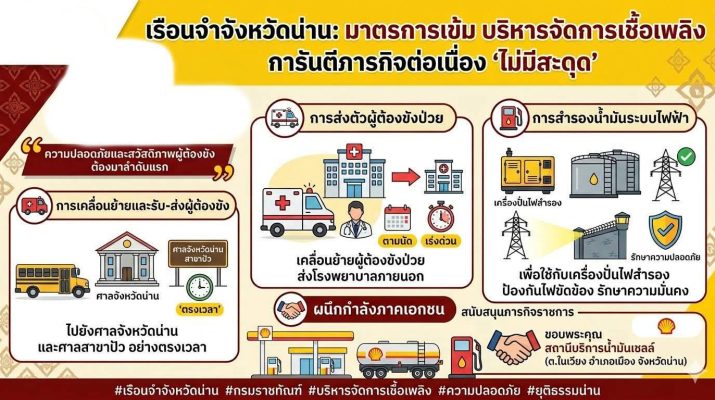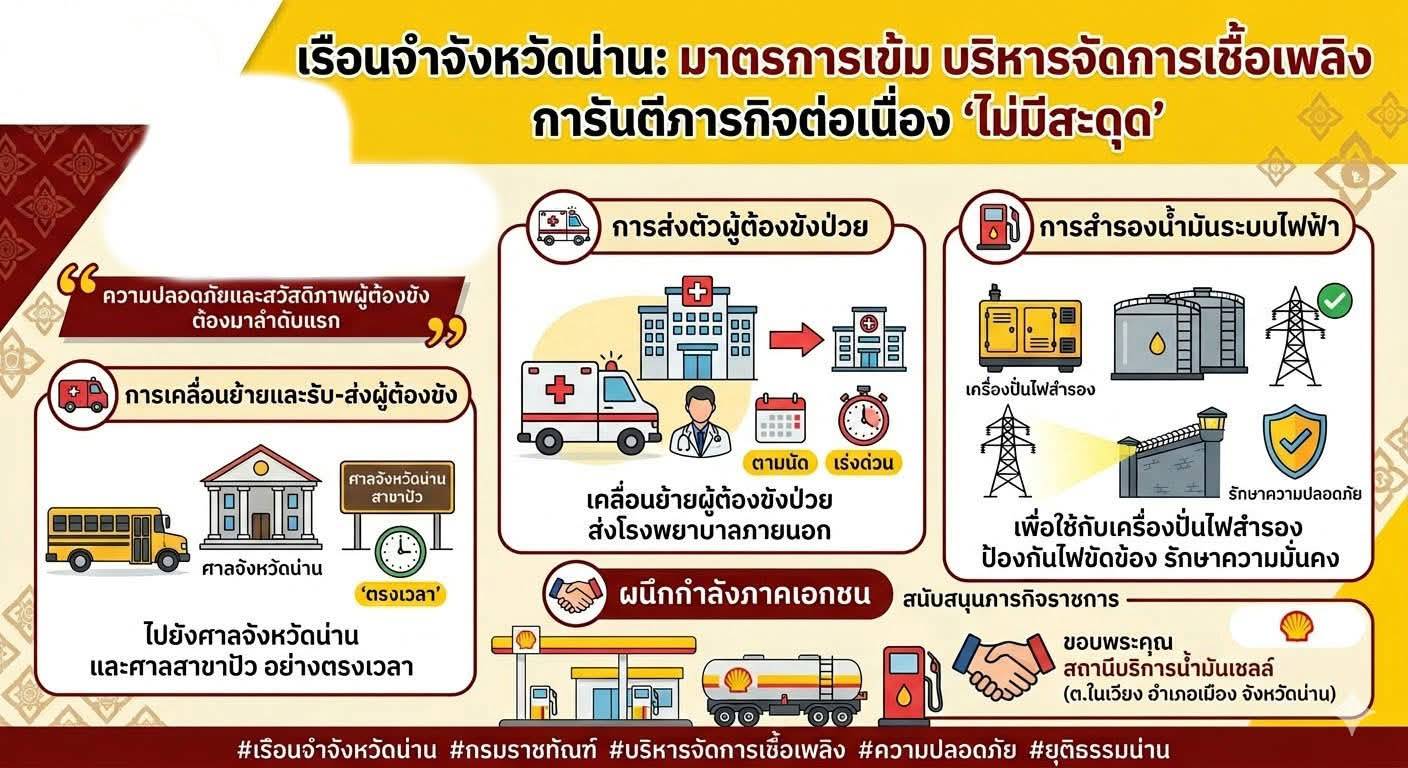นางสาวรัตนภรณ์ เวียงนาค เปิดเผยว่า เรือนจำจังหวัดน่านได้เตรียมความพร้อมด้านเชื้อเพลิงสำหรับการปฏิบัติภารกิจสำคัญของหน่วยงาน เพื่อให้การดำเนินงานเป็นไปอย่างต่อเนื่องและมีประสิทธิภาพ โดยเฉพาะภารกิจด้านการรักษาความมั่นคงและการดูแลผู้ต้องขัง