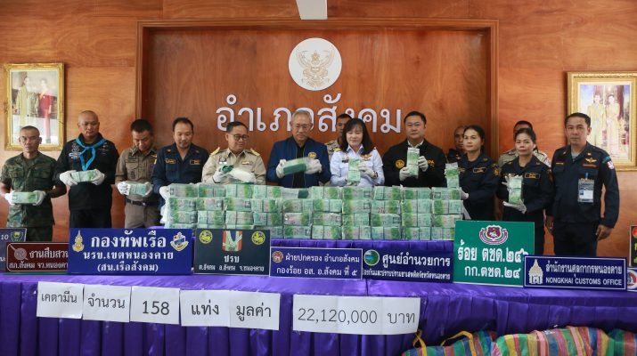 วันที่ 17 มี.ค.69 ณ ที่ว่าการอำเภอสังคม จ.หนองคาย นายสุชาติ ทอนมณี ปลัดจังหวัดหนองคาย ร่วมกับ นายนวน โทบุตร นอภ.สังคม, น.ส.วรรณา ผู้อุตส่าห์ นายด่านศุลกากรหนองคาย,พ.ต.อ.อดุลย์ ศรีทอง ผกก.สภ.สังคม,นายชัยสิทธิ์ คำภาจันทร์ หน.ศูนย์อำนวยการป้องกันและปราบปรามยาเสพติด จว.นค.,ร.อ.ยุทธนา สีไสย์ ผบ.ร้อย ฉก.ทพ.2110 ฉก.ทพ.21,ชรบ.,อส.และหน่วยงานความมั่นคง แถลงผลการตรวจยึดยาเสพติดประเภท 2 (เคตามีน)จำนวน 158 กก.ได้ที่บริเวณเมรุ บ้านแก้งใหม่ ต.สังคม อ.สังคม จ.หนองคาย ใกล้กับริมฝั่งแม่น้ำโขง