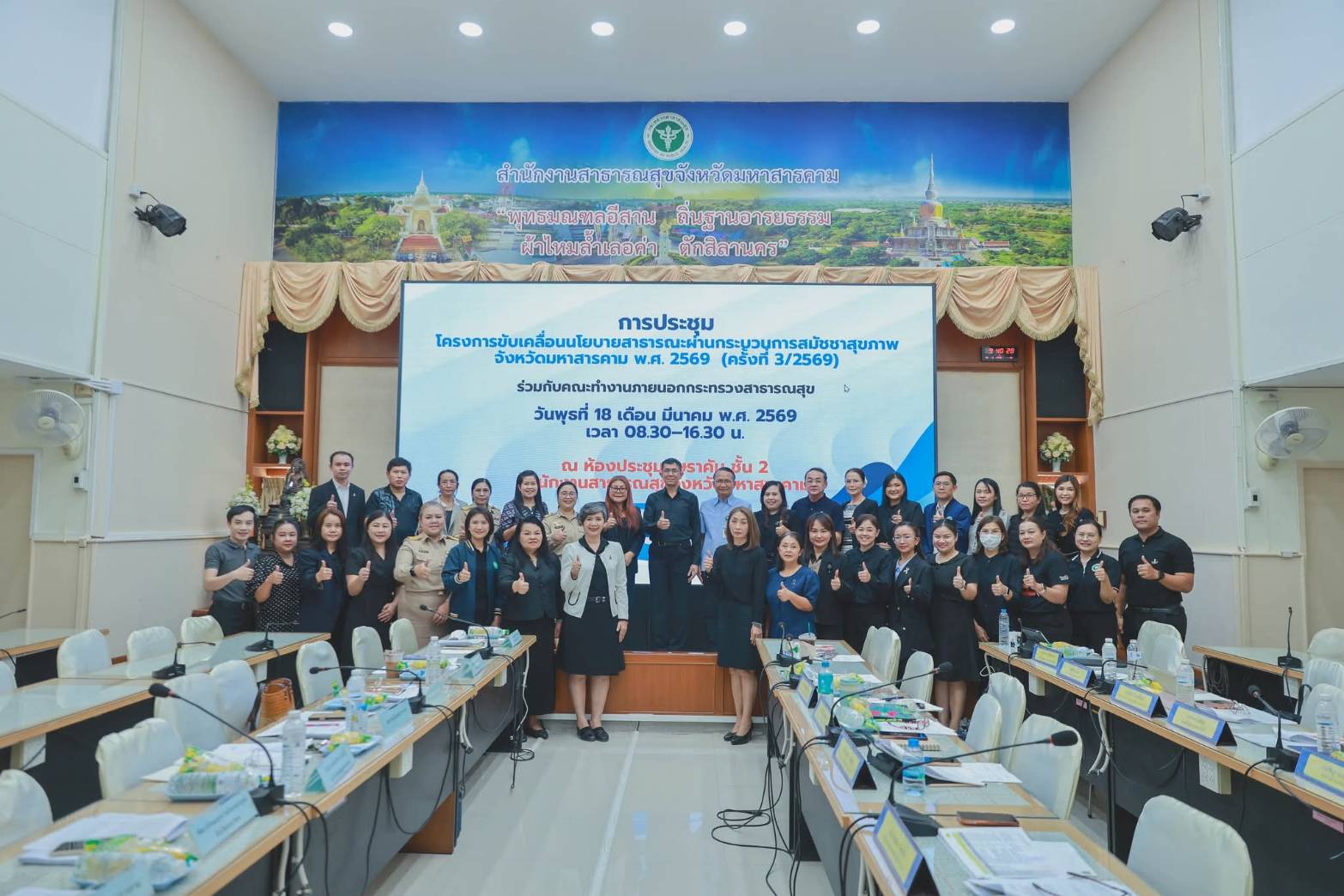 วันที่ 18 มีนาคม 2569 ณ ห้องประชุมบุษราคัม ชั้น 2 สำนักงานสาธารณสุขจังหวัดมหาสารคาม นายแพทย์หัสชา เนือยทอง นายแพทย์สาธารณสุขจังหวัดมหาสารคาม ประธานการประชุมโครงการขับเคลื่อนนโยบายสาธารณะผ่านกระบวนการสมัชชาสุขภาพจังหวัดมหาสารคาม พ.ศ. 2569 (ครั้งที่ 3/2569) เพื่อประชุมคณะทำงานสมัชชาสุขภาพจังหวัด ในการขับเคลื่อนนโยบาย/มติสมัชชาจังหวัด ประเด็น “จังหวัดมหาสารคาม พร้อมรับสังคมสูงวัย ปี 2569” การจัดทำธรรมนูญจังหวัดมหาสารคามครั้งนี้ สอดคล้องกับธรรมนูญว่าด้วยระบบสุขภาพแห่งชาติ ฉบับที่ 3 พ.ศ. 2565 ที่มีสถานะเป็นกรอบทิศทางของระบบสุขภาพไทย เป็นข้อตกลงร่วมหรือแนวคิดร่วมที่ทุกภาคส่วนยอมรับ ในทิศทางระบบสุขภาพร่วมกัน เพื่อนำไปสู่เป้าหมายระบบสุขภาพและสังคมที่เป็นธรรม ซึ่งให้ความสำคัญกับการพัฒนากระบวนการมีส่วนร่วมของทุกภาคส่วนในการจัดสภาพแวดล้อมและระบบนิเวศให้เอื้อต่อการมีสุขภาพดี และการพัฒนาศักยภาพมนุษย์ในทุกกลุ่มทุกระดับ โดยธรรมนูญจังหวัดมหาสารคามฉบับนี้ จะส่งเสริมให้ประชาชนจังหวัดมหาสารคาม มีส่วนร่วมในการทำหน้าที่ขับเคลื่อนเป้าหมายคุณภาพชีวิตที่ดีของผู้สูงอายุภาพรวมของจังหวัด โดยอาศัยกลไกและเครือข่ายในภาคราชการและนอกภาคราชการมาร่วมมือกัน เพื่อเสริมพลังในการขับเคลื่อนเป้าหมายจังหวัดสุขภาพดี มุ่งเป้าให้ประชาชน “มีคุณภาพชีวิตที่ดี มีอายุยืน”