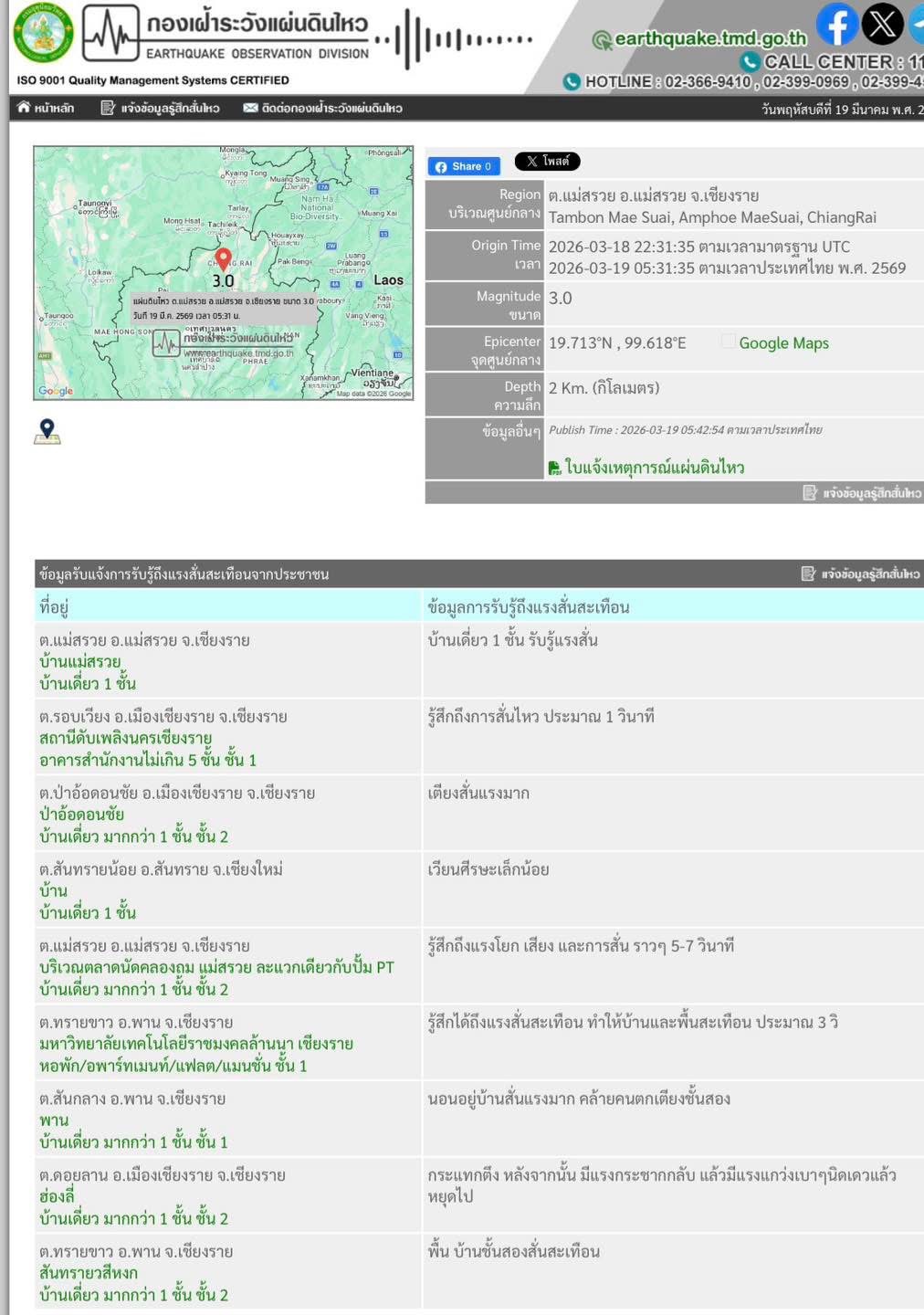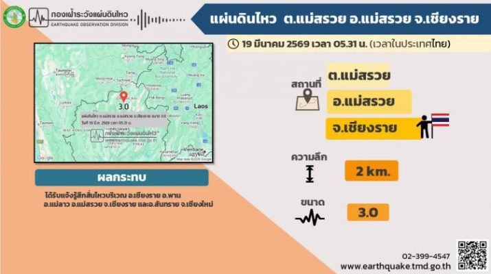 ทุกมุมทั่วไทย 19 มีนาคม 2026 แผ่นดินไหว ขนาด 3.0 พื้นที่ ต.แม่สรวย อ.แม่สรวย จ.เชียงราย Posted By: namchan เมื่อเวลา 05.31น. วันที่ 19 มีนาคม 2569 กองเฝ้าระวังแผ่นดินไหวตรวจพบแผ่นดินไหว ที่บริเวณ ต.แม่สรวย อ.แม่สรวย จ.เชียงรายขนาด 3.0 ลึก 2 กม. โดยได้รับแจ้งรู้สึกสั่นไหวบริเวณ อ.เมืองเชียงราย อ.พาน และ อ.แม่ลาว อังคณา เชียงราย