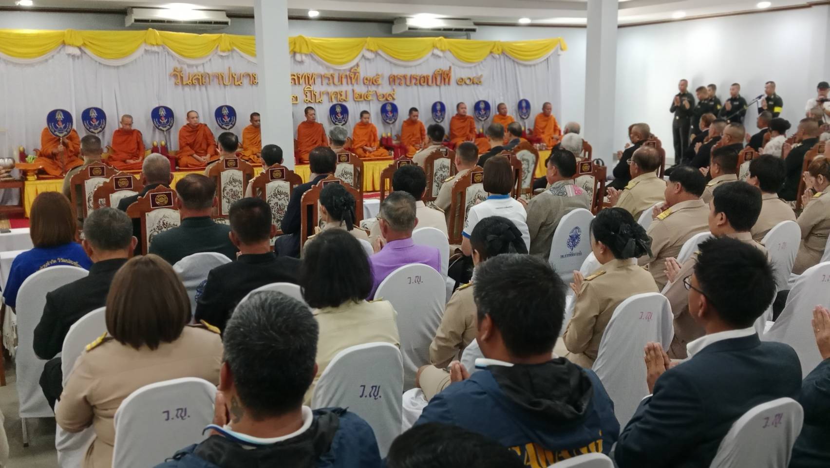โดยในช่วงเช้ามีพิธีสงฆ์โดยประธานในพิธีจุดธูปเทียนบูชาพระรัตนตรัยและธูปเทียนเครื่องทองน้อยหน้าโกฎิอัฐิอดีตกำลังพลที่ล่วงลับไปแล้วหลังจากเสร็จพิธีสงฆ์มีพิธีมอบทุนการศึกษาให้กับบุตรหลานกำลังพล โดยชั้นอนุบาลและชั้นประถม ทุนละ 700 บาท จำนวน 215 ทุนและชั้นมัธยม ถึงขั้น ปวช. ทุนละ 900 บาท 130 ทุน ชั้น อนุปริญา ปวส. ป.ตรี ทุนละ 1,100 บาท 55 ทุน รวมทั้งสิ้น 400 ทุน คิดเป็นมูลค่า 328,000 บาท( สามแสนสองหมื่นแปดพันบาทถ้วน)