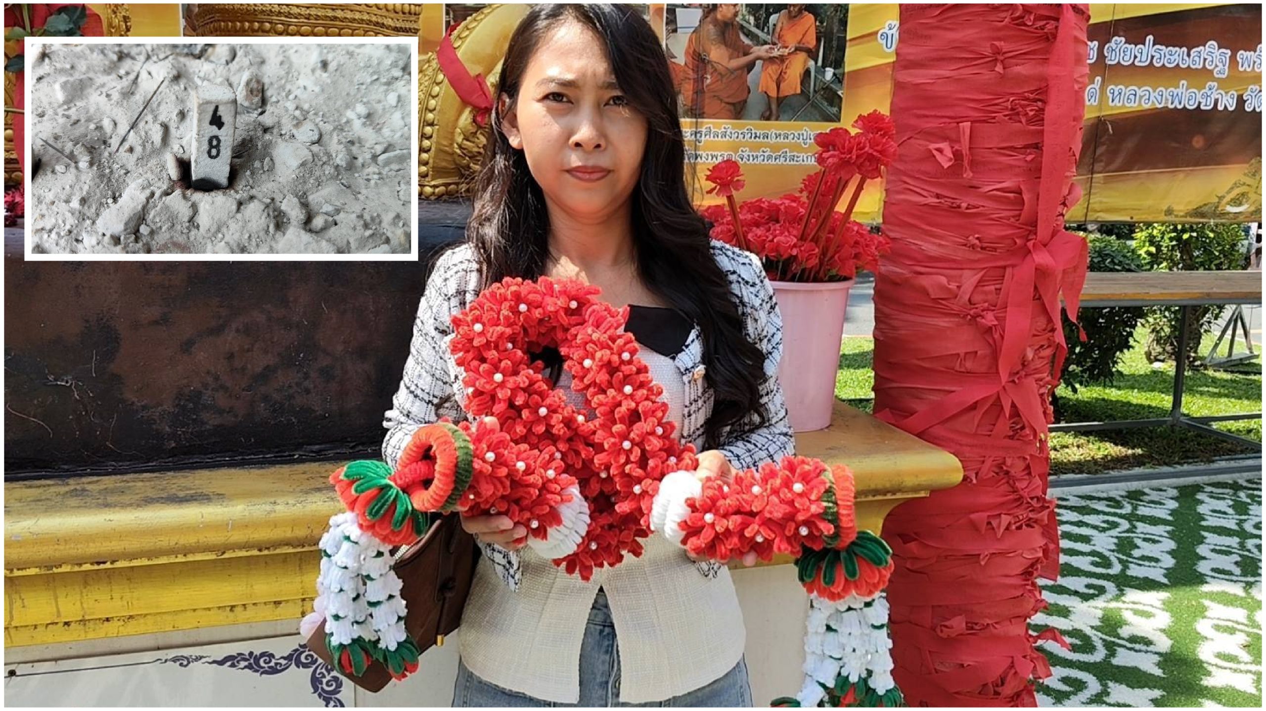 ด้านนางสาววราภรณ์ โตบัวงาม แม่ค้าขายออนไลน์ผ่าน TikTok ชื่อ “ล่ำซำ ค้าส่ง” พร้อมด้วยครอบครัว เดินทางมาจากบางปูใหม่ จ.สมุทรปราการ นำเครื่องเซ่นไหว้ชุดใหญ่ 2 ชุดมาแก้บนกับท้าวเวสสุวรรณหลังโชคดีรับโชคก้อนโตในงวดที่ผ่านมา และยอดขายขายได้เกือบล้านแล้ว นางสาววราภรณ์ กล่าวว่าการเดินทางมาในครั้งนี้เป็นครั้งที่ 6 ตนตั้งใจมาแก้บนและขอพรกับท้าวเวสสุวรรณอีกครั้ง หลังจากที่รอบก่อนหน้าตนได้ขอโชคลาภกลับไปและธุรกิจมีการเติบโตขึ้นอย่างต่อเนื่องตามลำดับ มีลู่ทางและโอกาสใหม่ๆ เข้ามาช่วยส่งเสริมให้ธุรกิจขยายตัวได้ดีขึ้น อีกทั้งยังมีโชคลาภในช่วงวันที่ 1 และ 16 ที่ผ่านมา ซึ่งได้รับทรัพย์ก้อนโตเกือบถึงหลักแสนบาท วันนี้ตนจึงตัดสินใจเดินทางมาแก้บนและถือโอกาศทำบุญใหญ่ด้วยการร่วมสร้างพระนอน และจะนำของมงคลกลับไปฝากเพื่อนๆ วันนี้ตนได้ขอพรให้ได้รับโชคลาภในระดับที่สูงขึ้นยิ่งกว่าเดิมที่หลักแสนถึงหลักล้านบาท หากประสบความสำเร็จตามที่ปรารถนาไว้ตนจะกลับมาแก้บนขอพรอีกครั้ง และก่อนกลับได้จุดธูปมงคลได้เลข 345 นำกลับไปลุ้นโชคครั้งที่ 7 ต่อไป