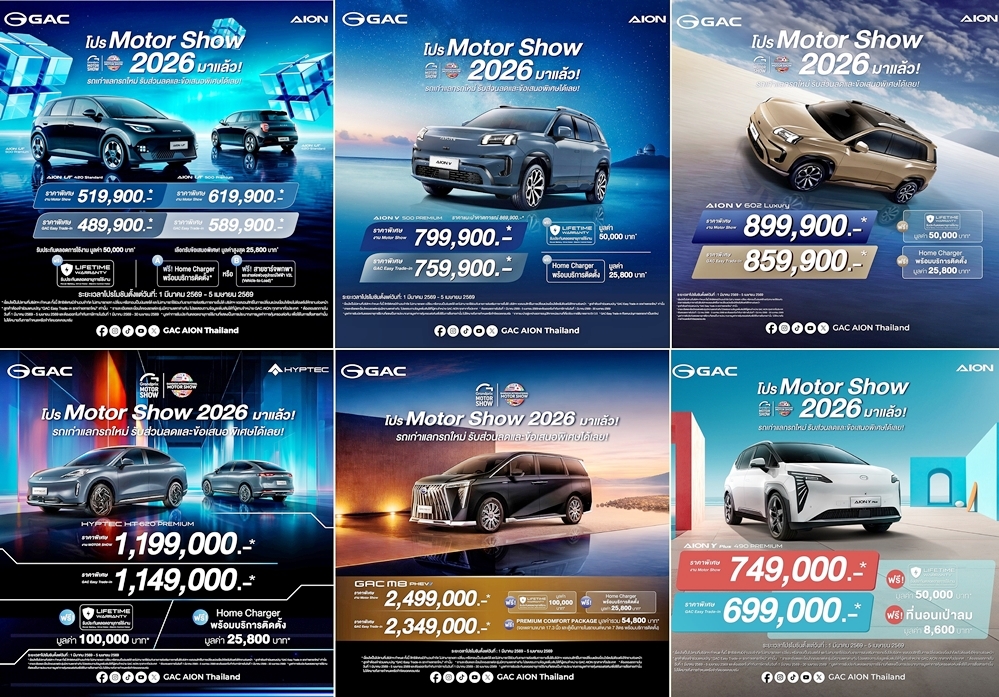 สำหรับลูกค้าที่สนใจสัมผัสประสบการณ์แห่งอนาคตและนวัตกรรมยานยนต์ไฟฟ้าระดับโลกจาก GAC สามารถเข้ามาชมรถคันจริงและร่วมทดลองขับรถยนต์พลังงานใหม่ทุกรุ่นจาก GAC ได้ที่บูธ GAC AION Thailand (บูธ A20) ณ อาคารชาเลนเจอร์ฮอลล์ 1 อิมแพ็ค เมืองทองธานี ตั้งแต่วันที่ 25 มีนาคม – 5 เมษายน 2569 หรือเข้าร่วมแคมเปญ Trade-in และสัมผัสตัวจริงได้ที่โชว์รูม GAC AION ทั่วประเทศ