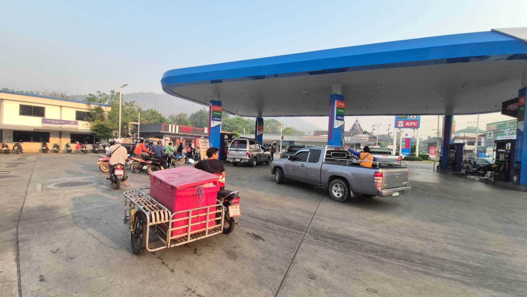 ราคาน้ำมันหน้าปั๊มที่จังหวัดแม่ฮ่องสอน ที่ขยับขึ้นหนักในเช้าวันนี้ ( 26 มีนาคม 2569 ) ที่ปั๊ม ปตท.แม่ฮ่องสอน พบว่าบรรยากาศเป็นไปอย่างเงียบเหงา ไม่มีรถหรือผู้เข้าไปใช้บริการรอเติมน้ำมันเหมือนวันก่อนๆ ที่สำคัญไม่มีผู้ที่นำแกลลอนออกมาซื้ออีกด้วย แต่ละคนต่างก็ยอมรับสภาพที่ต้องใช้น้ำมันแพงตามคาด หลังจากรัฐบาลประกาศขึ้นราคาลิตรละ 6-8 บาท โดยน้ำมันดีเซลพรีเมี่ยมลิตรละ 56.04 บาท ดีเซลB7 ลิตรละ 40.34 บาท เบนซินE20 ลิตรละ 37.45 บาท เบนซิน91 ลิตรละ 42.08 บาทและเบนซิน 95 ลิตรละ 42.45 บาท ในส่วนของเกษตรกรยังถือว่าโชคดี เพราะทำการเก็บเกี่ยวผลผลิตกระเทียมเสร็จแล้วและอยู่ระหว่างนำออกจำหน่ายกับพ่อค้า จึงไม่ต้องใช้น้ำมันเพื่อการเพาะปลูกมากนัก