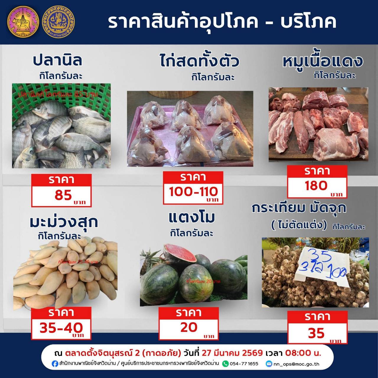 วันที่ 27 มีนาคม 2569 เวลา 08.00 น. สำนักงานพาณิชย์จังหวัดน่าน ลงพื้นที่ตรวจสอบสถานการณ์ราคาสินค้าอุปโภคบริโภค ณ ตลาดตั้งจิตนุสรณ์ 2 (กาดอภัย) เพื่อดูแลค่าครองชีพประชาชนอย่างใกล้ชิด