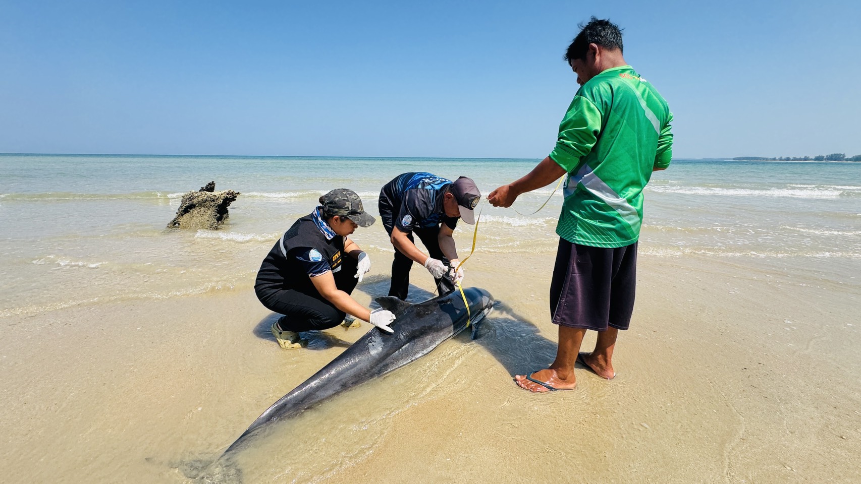 พังงา – เจ้าหน้าที่ทรัพยากรทางทะเลและชายฝั่งเร่งตรวจสอบ หลังได้รับแจ้งพบโลมาเกยตื้นเสียชีวิตบริเวณชายหาดบางสัก อำเภอตะกั่วป่า จังหวัดพังงา