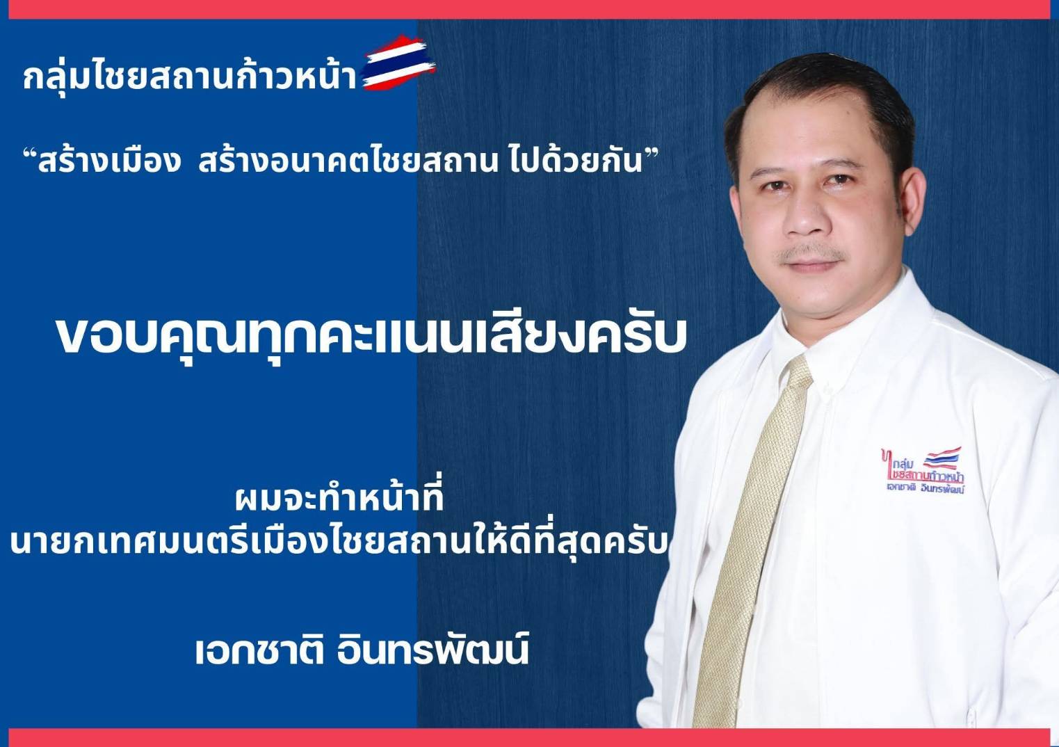 นายเอกชาติ อินทรพัฒน์ หรือ “นายกฯ แบงค์” อดีตนายกองค์การบริหารส่วนตำบลไชยสถาน และหัวหน้ากลุ่ม “ไชยสถานก้าวหน้า” ได้รับความไว้วางใจจากประชาชนในพื้นที่ เลือกตั้งให้ดำรงตำแหน่งนายกเทศมนตรีเมืองไชยสถานเป็นคนแรก พร้อมทีมงาน 13 คน โดย เขตเลือกตั้งที่ 1 ได้ 5 คน เขตเลือกตั้งที่ 2 ได้ 3 คน และเขตเลือกตั้งที่ 3 ได้ 5 คน