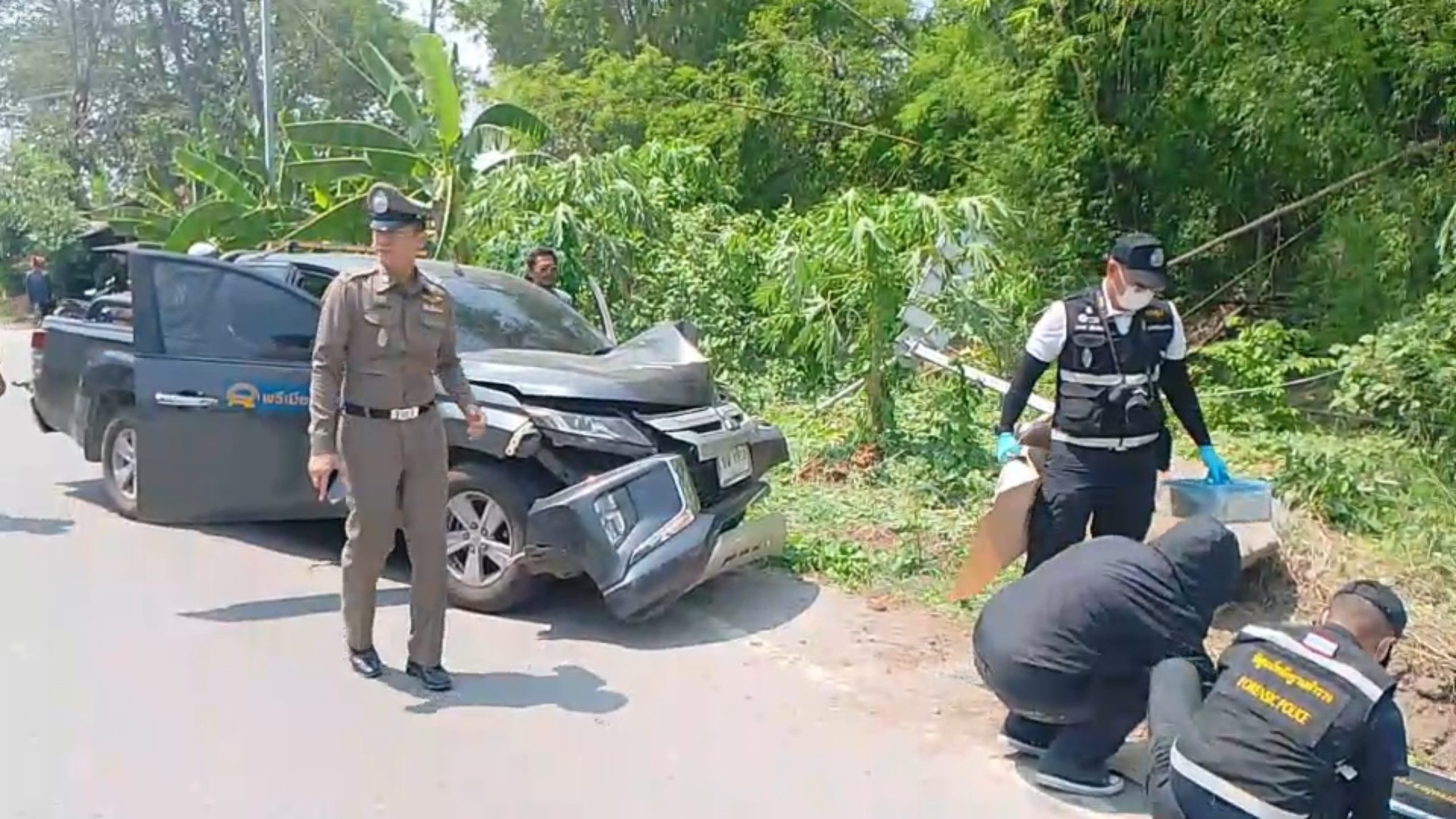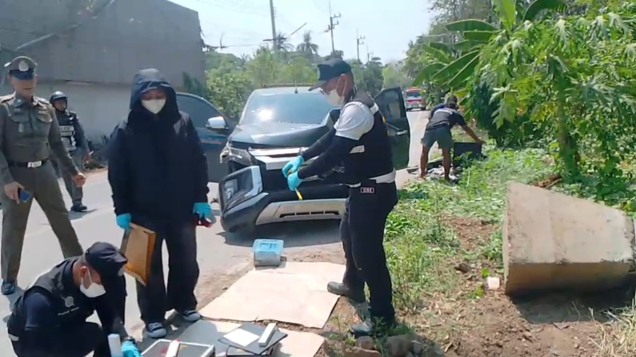 ที่เกิดเหตุ พบรถกระบะ มิตซู ไทรทัน สีดำ ทะเบียน บน 1960 ปทุมธานี พลิกตะแคงหน้ารถชนเสาไฟส่องสว่างหักล้ม ท้ายกระบะมีเครื่องมือช่างอุปกรณ์ไฟฟ้า ตกอยู่ โดยพบนาย ตฤณกร รุ่งธนานราธร อายุ 39 ปี ยืนอยู่กับภรรยาและลูกน้องอีก 3 คน ซึ่งให้การกับตำรวจว่า ตนเองมีอาชีพรับเหมาก่อสร้างกำลังขับรถมาจากย่านบางแค กรุงเทพกำลังจะไปบ้านที่ ตำบลสามความเผือก อำเภอเมืองนครปฐม เห็นรถกระบะที่ขับอยู่ข้างหน้าเสียหลักชนเสาไฟพลิกตะแคง ตนจึงจอดรถและรีบไปช่วยกับลูกน้องโดยมีชาวบ้านแถวนั้นเข้าไปช่วยกัน แต่พบว่าคนขับเป็นชายวัยรุ่นไม่ใส่เสื้อ ปีนรถออกมา และถือมีดมาด้วย ตนจึงตะโกนบอกภรรยา ที่นั่งอยู่ในรถให้ระวังตัว แต่คนร้ายได้วิ่งไปที่รถ ภรรยาจึงดับเครื่องและเอากุญแจออกมาโยนให้ตน แต่คนร้ายก็ได้วกกลับและวิ่งถือมีดตามมาและเอากุญแจรถขับหลบหนีไป ท่ามกลางความงุนงง และคิดเพียงจะไปช่วยคนบาดเจ็บแต่มาทราบภายหลังว่าชายคนนั้นเป็นคนร้ายที่กำลังหลบหนีการจับกุมของเจ้าหน้าที่ตำรวจ