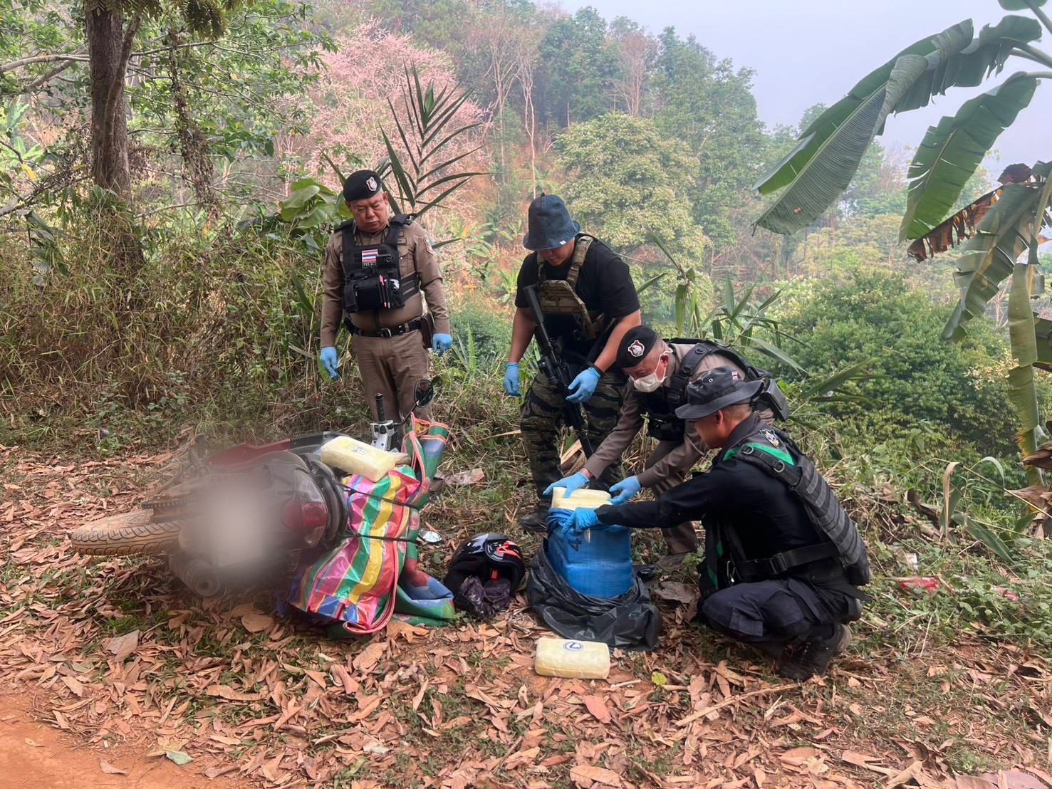 รถจักรยานยนต์และทิ้งรถจักรยานยนต์วิ่งหลบหนีเข้าป่า เจ้าหน้าที่ตำรวจได้วิ่งติดตามไป ชายดังกล่าวได้ใช้ความชำนาญในพื้นที่สามารถหลบหนีไปได้