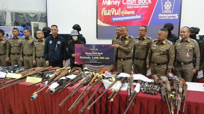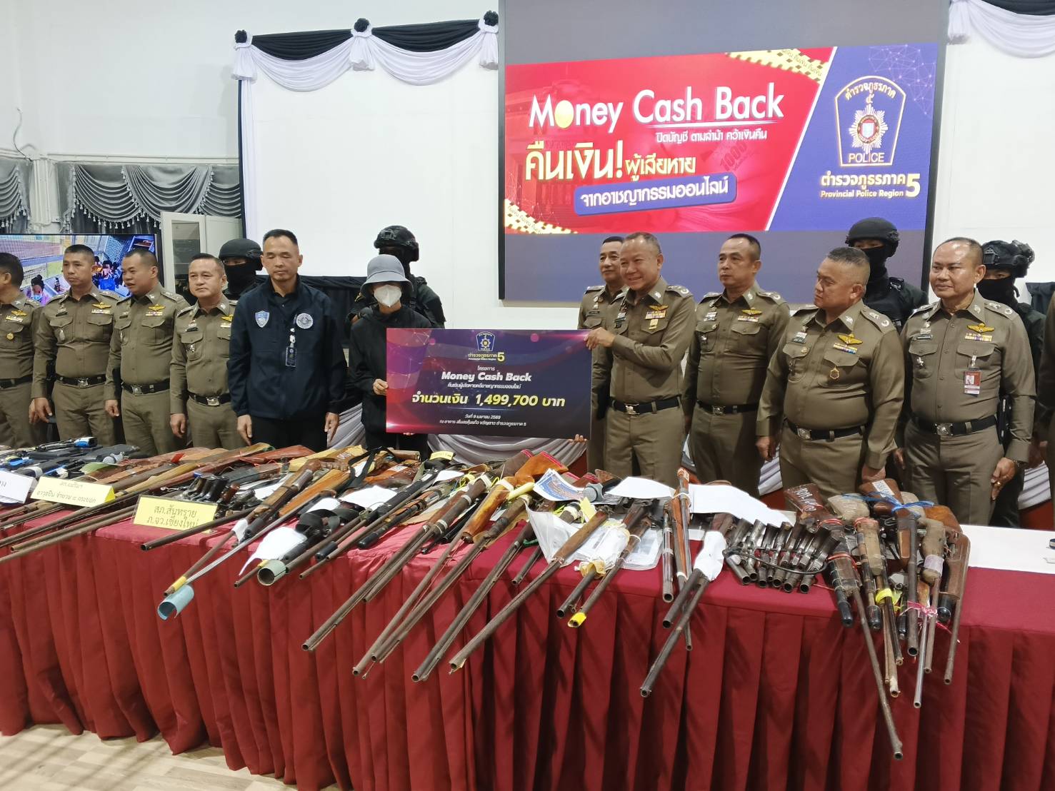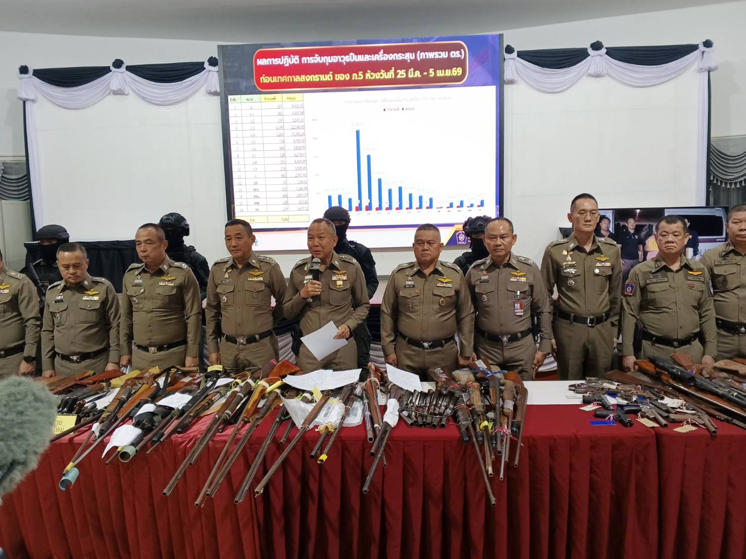 วันที่ 9 เมษายน 2569 ที่สำนักงานตำรวจภูธรภาค 5 อ.เมือง จ.เชียงใหม่ พล.ต.ท.กฤตธาพล ยี่สาคร ผบช.ภ.5 เป็นประธานแถลงข่าวการระดมกวาดล้างอาชญากรรม เป้าหมายผู้กระทำความผิดเกี่ยวกับอาวุธปืนและเครื่องกระสุน และการสืบสวนจับกุมบุคคลตามหมายจับคดีอาญา ในห้วงก่อนเทศกาลสงกรานต์ (25 มี.ค. – 5 เม.ย. 69) โดยมี พล.ต.ท.นพดล กรึงไกร ผู้ทรงคุณวุฒิพิเศษ ตร. พล.ต.ต.ธวัชชัย พงษ์วิวัฒน์ชัย รอง ผบช.ภ.5 และ พล.ต.ต.ยุทธนา แก่นจันทร์ ผบก.ภ.จว.เชียงใหม่ ร่วมแถลง พร้อมนำอาวุธปืน เครื่องกระสุน และระเบิดที่ยึดได้มาแสดงกว่า 200 รายการ