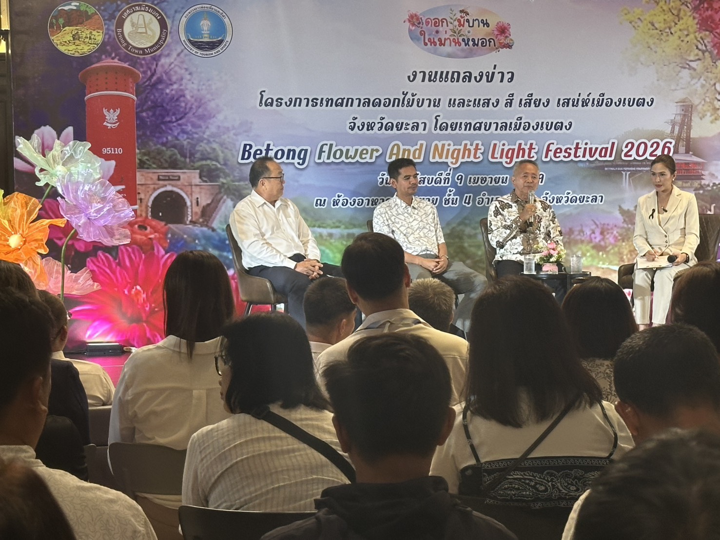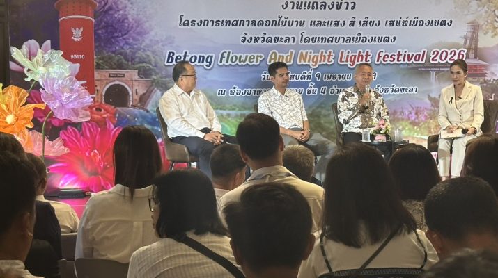 วันที่ 9 เมษายน 2569 ที่ห้องอาหารสุดสยาม ชั้น 4 อำเภอเบตง จังหวัดยะลา นายใช้ วงศ์นิตยลัภย์ นายกเทศมนตรีเมืองเบตง พร้อมด้วย นิรันดร์ สุนทรศิริ ปลัดอาวุโสอำเภอเบตง และนายนรินทร์ เรืองวงศา นายกสมาคมธุรกิจการท่องเที่ยวอำเภอเบตง ร่วมแถลงข่าวการจัดงาน “เทศกาลดอกไม้บาน และแสง สี เสียง เสน่ห์เมืองเบตง” เตรียมจะจัดขึ้นระหว่างวันที่ 12 เมษายน – 4 พฤษภาคม 2569 ในพื้นที่เขตเทศบาลเมืองเบตง เพื่อกระตุ้นเศรษฐกิจและส่งเสริมการท่องเที่ยวสู่ใต้สุดสยาม
