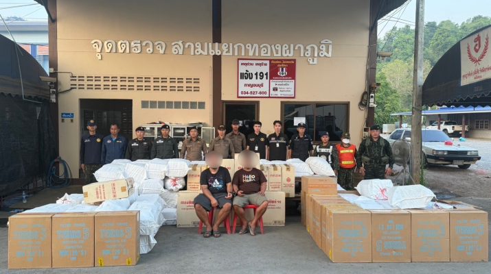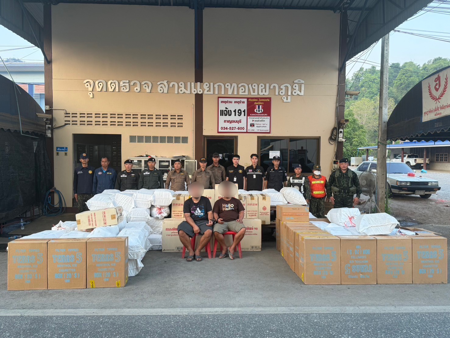 ต่อมาเวลา 15.00 น. ขณะที่เจ้าหน้าที่ตั้งจุดตรวจจุดสกัด บริเวณ จุดตรวจร่วมสามแยกทองผาภูมิ หมู่ที่ 1 ตำบลท่าขนุน อำเภอทองผาภูมิ จังหวัดกาญจนบุรี เจ้าหน้าที่สังเกตพบรถยนต์กระบะ ยี่ห้อ Toyota Revo สีเทา หมายเลขทะเบียน กาญจนบุรี ลักษณะบรรทุกสิ่งของจำนวนมากด้านท้ายกระบะ จึงให้สัญญาณหยุดรถเพื่อทำการตรวจสอบ พบ นายจตุรงค์ อายุ 33 ปี สัญชาติไทย เป็นผู้ขับขี่ และนายแอด ไม่มีชื่อสกุล อายุ 37 ปี สัญชาติเมียนมา นั่งโดยสารมาด้วย จึงได้ทำการตรวจสอบอย่างละเอียด จึงพบของกลาง บุหรี่เลี่ยงภาษีรวมทั้งสิ้น จำนวน 6,590 คอตตอน ซุกซ่อนอยู่บริเวณด้านท้ายรถยนต์คันดังกล่าว โดยใช้ผ้าใบปิดบังการตรวจสอบจากเจ้าหน้าที่ รวมมูลค่าเปรียบเทียบปรับของสรรพสามิต เป็นเงินกว่า 59,310,000 บาท