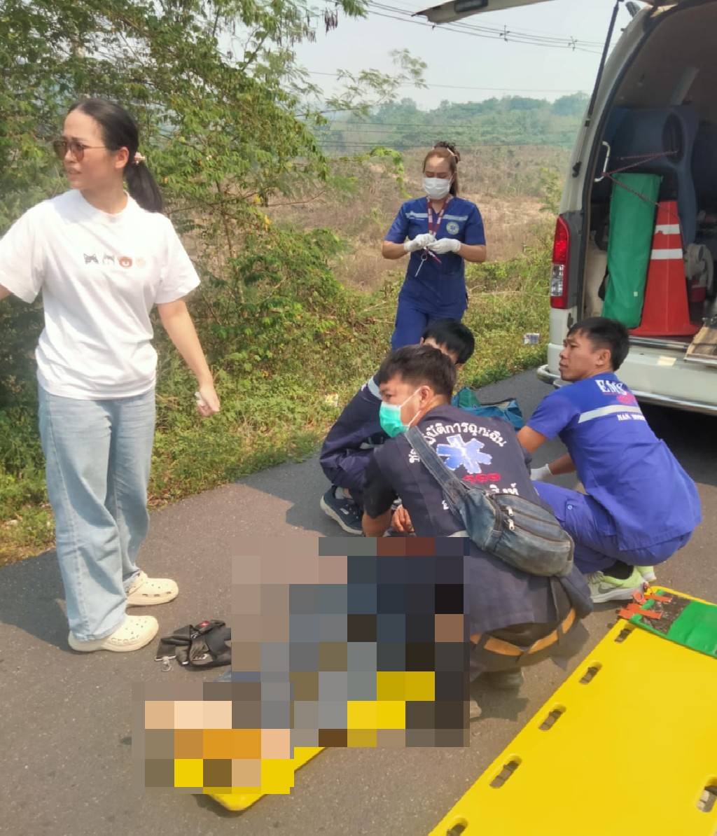 ผู้บาดเจ็บเป็นชาย อายุ 67 ปี ชาวตำบลบ่อ มีอาการหมดสติ ปลุกไม่ตื่น จำเหตุการณ์ไม่ได้ มีบาดแผลบริเวณมุมปาก และแผลเปิดที่ข้อมือซ้าย รวมถึงมีอาการสับสน เจ้าหน้าที่กู้ชีพ–กู้ภัย อบต.ผาสิงห์ ได้ทำการปฐมพยาบาล ณ จุดเกิดเหตุ ก่อนส่งต่อให้รถ EMS ของโรงพยาบาลน่าน นำตัวเข้ารับการรักษาต่อ