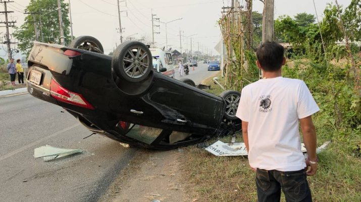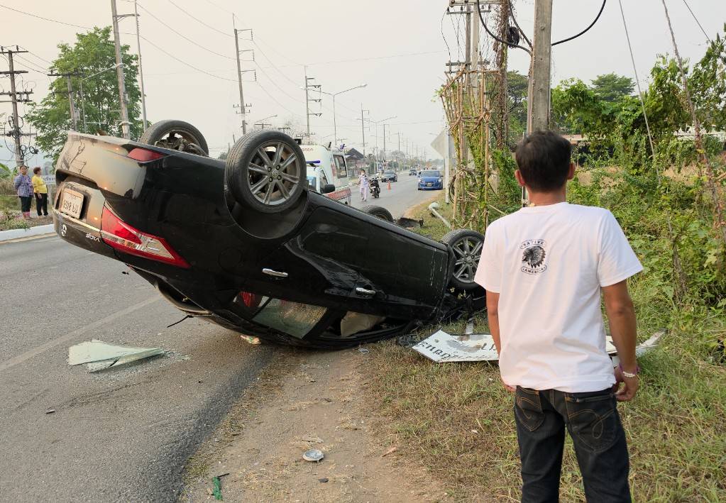จากการสอบถามเบื้องต้น คนขับให้การว่า ขณะขับรถกลับบ้านเกิดอาการวูบหรือหลับใน ทำให้รถเสียหลักพุ่งชนเกาะกลางและเสาไฟฟ้า รู้สึกตัวอีกครั้งเมื่อรถพลิกคว่ำแล้ว โดยโชคดีที่คาดเข็มขัดนิรภัยจึงไม่ได้รับบาดเจ็บรุนแรง