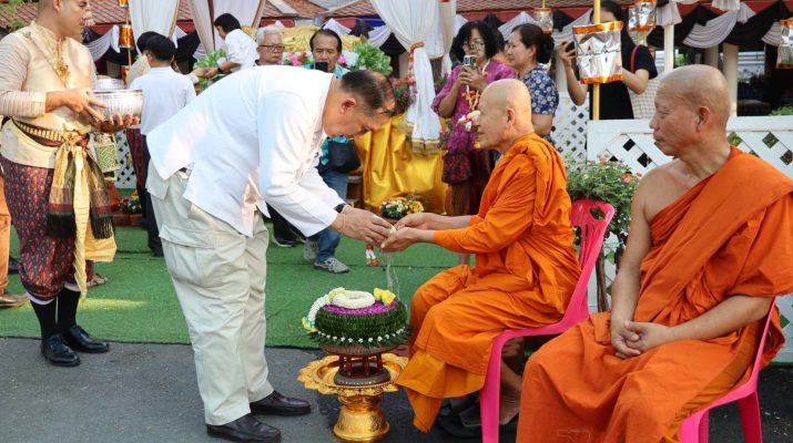 ภายหลังเสร็จสิ้นพิธีปารุปะนัง ได้มีการประกอบพิธีรดน้ำขอพร และพิธีสรงน้ำพระพุทธไสยยาสน์จำลอง รวมถึงสรงน้ำพระภิกษุสามเณร โดยพุทธศาสนิกชนต่างนำขันน้ำอบไทย น้ำปรุง และดอกไม้มงคล มาร่วมรดสรงอย่างเป็นระเบียบและนอบน้อม เพื่อความเป็นสิริมงคลแก่ตนเองและครอบครัว เนื่องในโอกาสวันขึ้นปีใหม่ไทย