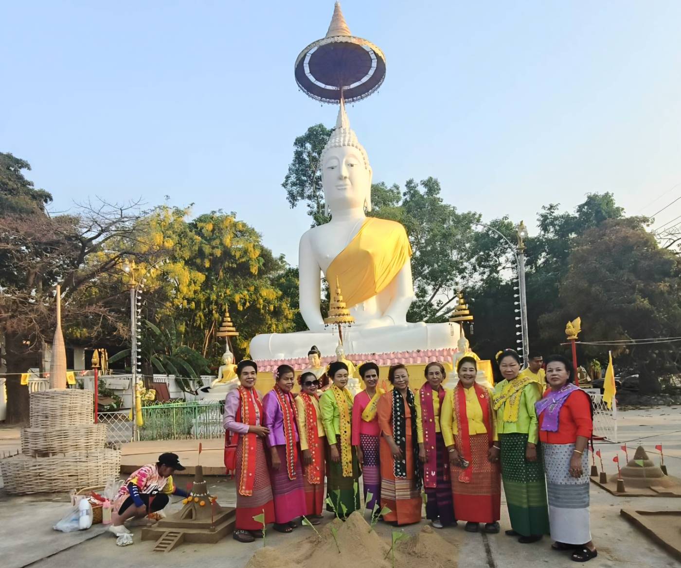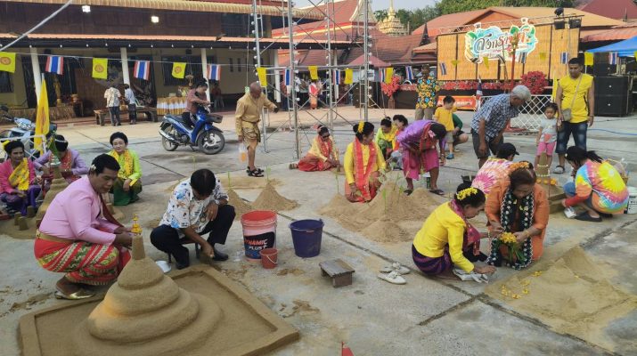 จากนั้นก็มีการก่อพระเจดีย์ทรายที่ถือว่าเป็นการนำทรายเข้าวัดเพราะการที่มาทำบุญแต่ละครั้งก็จะมีทรายติดตัวไปด้วยเพื่อการก่อพระเจดีย์ทราย เป็นการนำทรายเข้าวัด มีการละเล่นพื้นบ้าน พร้อมร่วมกันสรงน้ำหลวงพ่อขาวพระที่ชาวไทยเชื้อสายมอญเคารพและนับถือเป็นอย่างมาก รวมทั้งสรงน้ำพระแบบใช้รางน้ำมีพระนั่งอยู่ในห้องให้ประชาชนได้สรงน้ำกัน ทั้งนี้เพื่อเป็นการสร้างบรรยากาศในวันสงกรานต์ของมอญได้สนุกสนานขึ้นโดยในการจัดงานในปีนี้อาจจะดูเงีบบเหงา เพราะลูกหลานที่เดินทางไปทำงานในต่างจังหวัดไม่ได้กลับมาผลกระทบจากเศรษฐกิจ น้ำมันแพงแต่ชาวไทยเชื้อสายมอญในลพบุรีก็ยังคงจัดงานอนุรักษ์สืบสานประเพณีอันดีงามไว้สืบไป #ลพบุรี