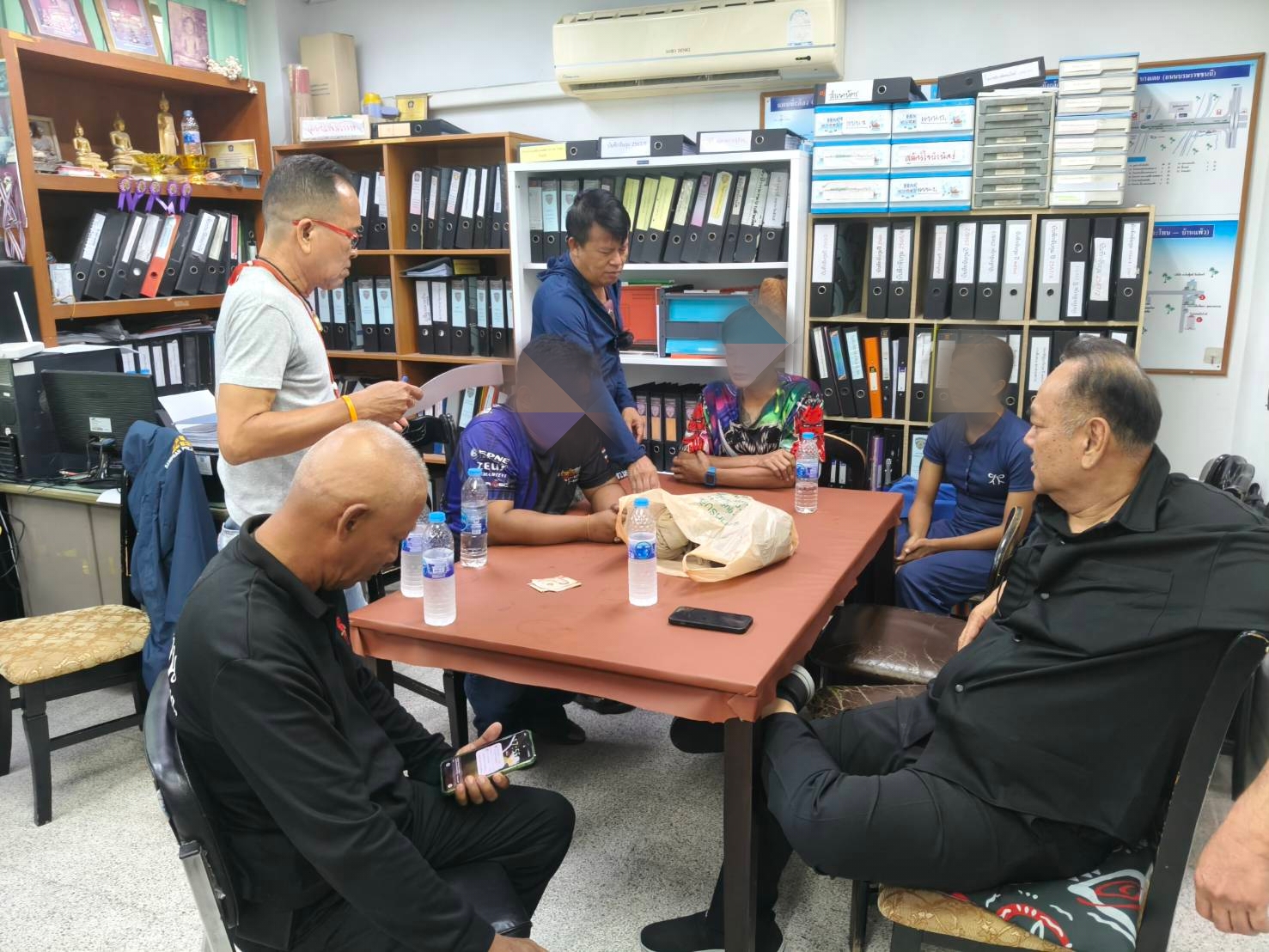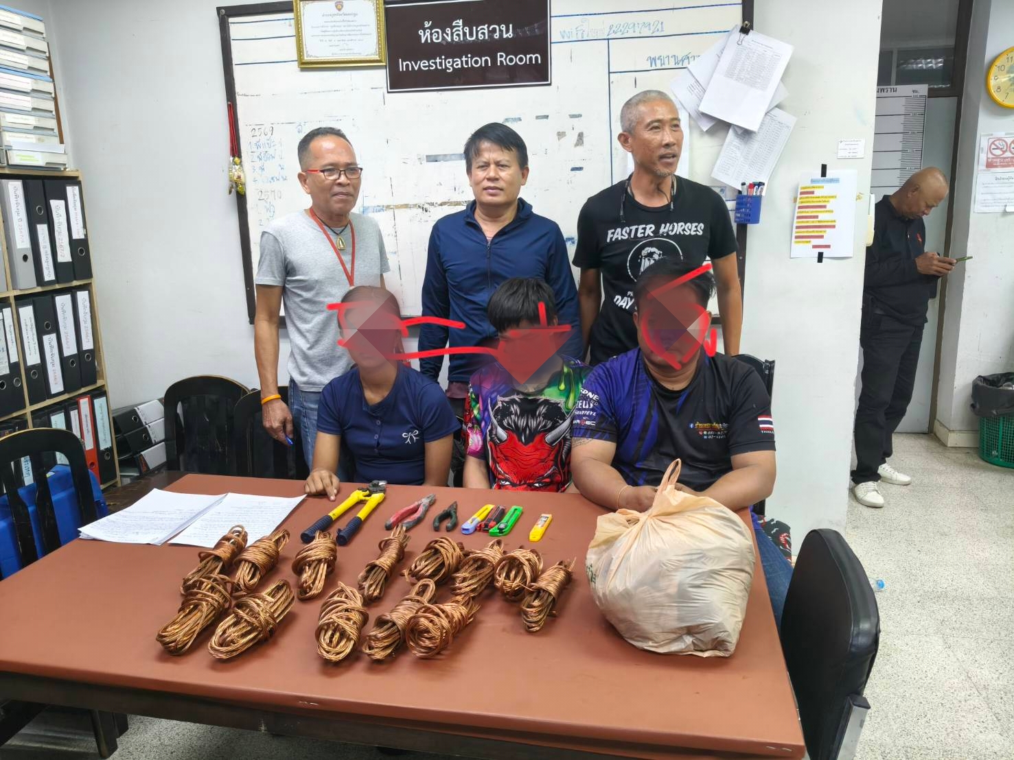 พร้อมตรวจยึดของกลาง รถจักรยานยนต์ฮอนด้าเวฟ สีเทา-แดง สายไฟที่ปลอกเปลือกเหลือแต่ทองแดงหนัก 12 กิโลกรัม คีมตัดเหล็ก 1 อัน คีมปากแหลม 1 อัน มีดคัตเตอร์ 3 อัน ใบมีดคัตเตอร์ 1 กล่อง และเสื้อผ้าที่ใช้ในวันก่อเหตุ โดยจับกุมได้บริเวณหน้าบ้านเลขที่ 94/1 ซอยเพชรเกษม 106 แขวงหนองค้างพลู เขตหนองแขม กรุงเทพมหานคร