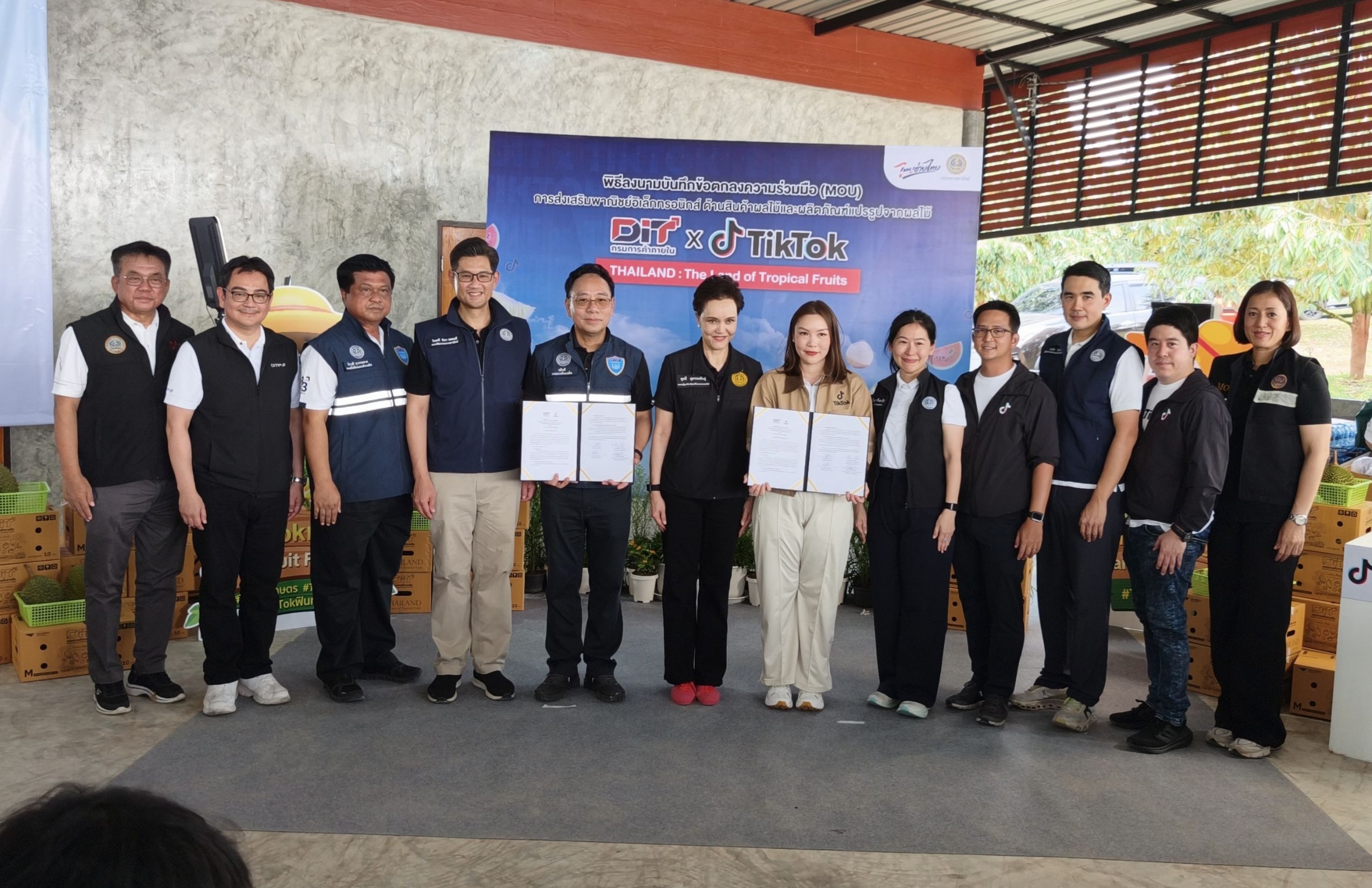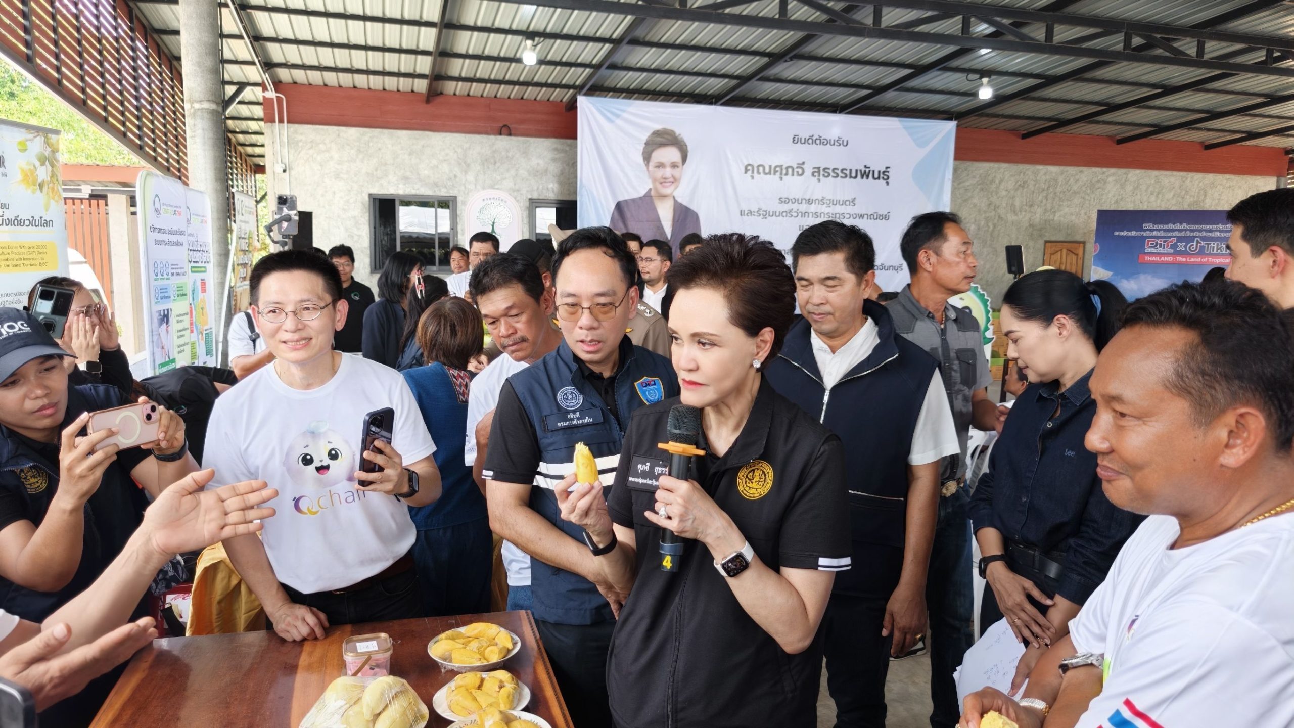 บรรยากาศคึกคัก เมื่อวันที่ (25 เมษายน 2569) นางศุภจี สุธรรมพันธ์ รองนายกรัฐมนตรีและรัฐมนตรีว่าการกระทรวงพาณิชย์ ลงพื้นที่จังหวัดจันทบุรี เดินหน้าขับเคลื่อนนโยบาย “ผลไม้คุณภาพ” อย่างเป็นรูปธรรม มุ่งยกระดับสินค้าเกษตรไทยสู่มาตรฐานสากล พร้อมเร่งเครื่องขยายตลาดส่งออกผ่านช่องทางออนไลน์อย่างเต็มกำลัง ช่วงบ่าย รองนายกรัฐมนตรีพร้อมคณะเดินทางไปยัง “สวนอาจารย์สมพงษ์ (ทุเรียน 100 ล้าน)” อำเภอเขาคิชฌกูฏ เพื่อติดตามกระบวนการผลิตทุเรียนคุณภาพส่งออก โดยมีนายมนต์สิทธิ์ ไพศาลธนวัฒน์ ผู้ว่าราชการจังหวัดจันทบุรี และหน่วยราชการภาครัฐ ภาคเอกชน ประชาชน พร้อมนายสมพงษ์ กลีบมาลี เจ้าของสวน ให้การต้อนรับและถ่ายทอดองค์ความรู้ บรรยายสรุปการผลิตทุเรียนคุณภาพ เพื่อการส่งออก ซึ่งเป็นหัวใจสำคัญของการสร้างมาตรฐานสินค้า ภายในพื้นที่ ยังมีการจัดแสดงผลิตภัณฑ์ทุเรียนคุณภาพภายใต้แบรนด์ Q-Chan และนวัตกรรมสินค้าแปรรูป เช่น เครื่องสำอางจากสารสกัดดอกทุเรียนแบรนด์ Durrianar Thailand สะท้อนศักยภาพการต่อยอดสินค้าเกษตรไทยสู่มูลค่าเพิ่ม ไฮไลต์สำคัญอยู่ที่พิธีลงนามบันทึกความร่วมมือ (MOU) ระหว่างกรมการค้าภายในกับแพลตฟอร์ม TikTok เพื่อส่งเสริมการค้าขายผลไม้และสินค้าแปรรูปผ่านระบบอีคอมเมิร์ซ พร้อมเยี่ยมชมการไลฟ์สดจำหน่ายสินค้าจริงของครีเอเตอร์ ซึ่งกำลังกลายเป็นเครื่องมือสำคัญในการเข้าถึงผู้บริโภครุ่นใหม่