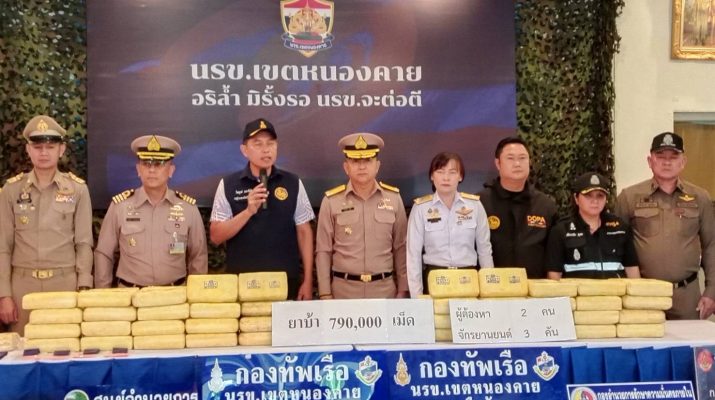 วันที่ 25 เมษายน 2569 ที่ นรข.เขตหนองคาย อ.ศรีเชียง ใหม่ จังหวัดหนองคาย พล.ร.ต.ณรงค์ เอมดี ผู้บัญชาการหน่วยเรือรักษาความสงบเรียบร้อยตามลำแม่น้ำโขง พร้อมด้วย นายไพฑูรย์ มหาชื่นใจ รองผู้ว่าราชการจังหวัดหนองคาย,น.อ.วิศิษฐ์พงศ์ เจริญวิชยเดช ผบ.นรข.เขตหนองคาย ,นาวาโทคมสัน จ้อยลี หัวหน้าสถานีเรือศรีเชียงใหม่, เรือเอกไพรสน พลเสน หัวหน้าสถานีเรือสังคม , นางสาววรรณา ผู้อุตส่าห์ นายด่านศุลกากรหนองคาย ,นายชัยสิทธิ์ คำภาจันทร์ หน.ศูนย์อำนวยการป้องกันและปราบปรามยาเสพติดจังหวัดหนองคาย ,นายจรัญ กลางประดิษฐ์ นายอำเภอศรีเชียงใหม่ ,ตร.สภ.ศรีเชียงใหม่ และหน่วยงานความมั่นคงในพื้นที่ ได้ร่วมกันแถลงผลการจับกุม 2 ผู้ต้องหา เครือข่าย“อาเฉิน” ขบวนการค้ายาเสพติดรายใหญ่ พร้อมยาบ้า 7.9แสนเม็ด