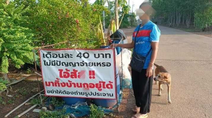 แต่ผู้ชายคนดังกล่าวก็ยังนำเอาถุงขยะมาทิ้งใส่ถังขยะที่หน้าบ้านของตนเองอีก จึงหมดความอดทน ลูกสาวจึงตัดสินใจสั่งทำป้ายไวนิลมาติดประกาศไว้ไม่ให้นำขยะมาทิ้ง เพื่อเป็นการเตือนไม่ให้นำมาทิ้ง หลังจากที่นำป้ายมาติดผู้ชายคนดังกล่าวขับรถผ่านหน้าบ้านก็ไม่ได้แวะเอาขยะมาทิ้งใส่ถังขยะที่หน้าบ้านอีกเลย