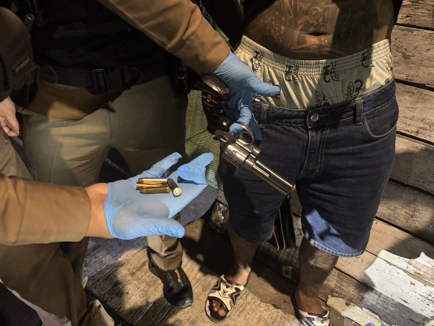 ผลการตรวจค้นพบอาวุธปืนลูกโม่ ยี่ห้อ Smith & Wesson Model 686-3 ขนาด .357 หมายเลขทะเบียน ร.บ.2/4725 หมายเลขประจำปืน BFL 8482 ลำกล้องยาวประมาณ 4 นิ้ว จำนวน 1 กระบอก พร้อมเครื่องกระสุนปืนขนาด .357 จำนวน 4 นัด บรรจุอยู่ภายในลูกโม่ โดยพกเหน็บอยู่บริเวณขอบกางเกงยีนส์ด้านหน้าลำตัว