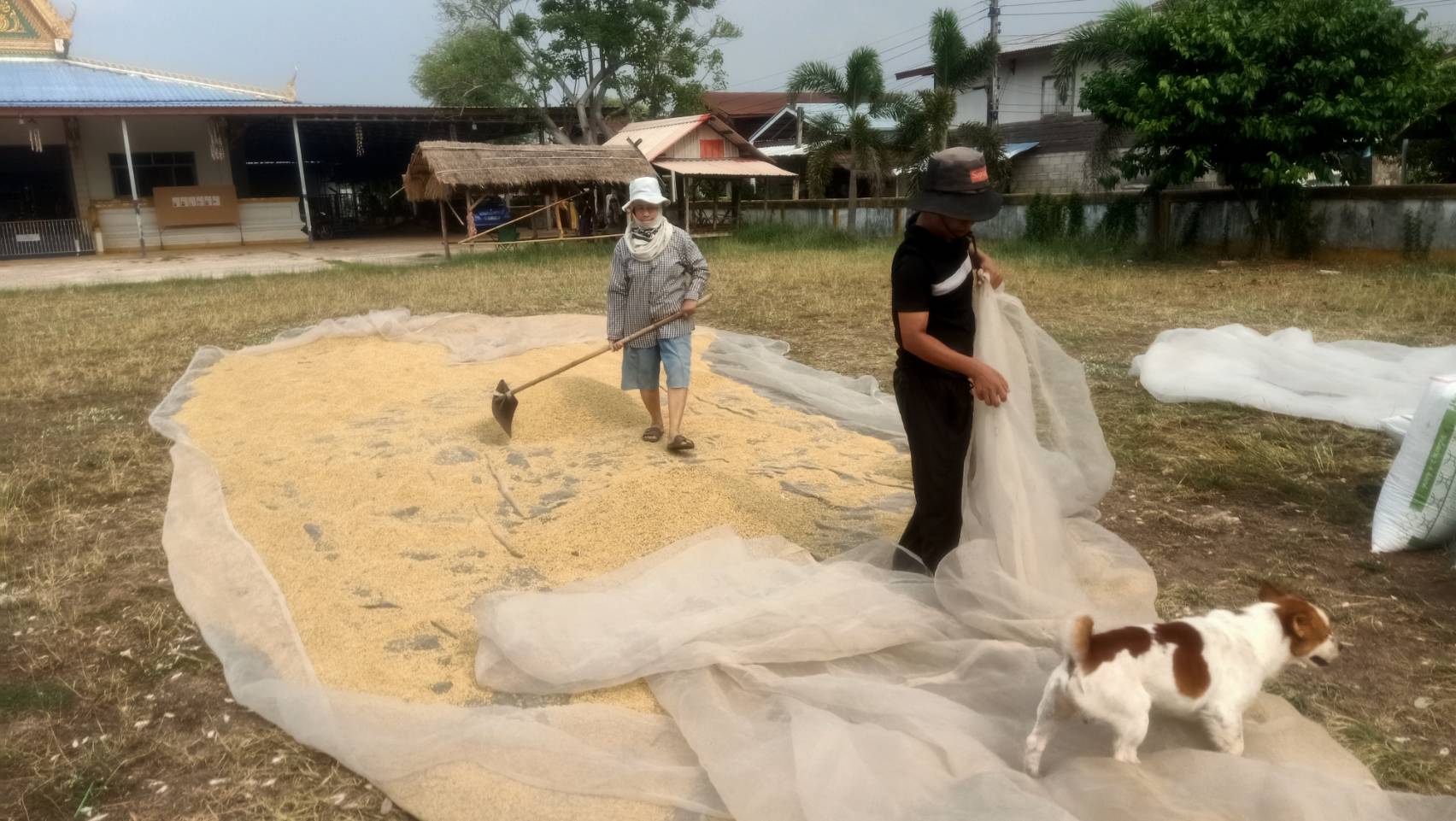 วันที่ 29 เมษายน 2569 นายประไพ คำปั้น อายุ อายุ 53 ปี บ้านเลขที่ 42 ม.6 ชาวบ้าน วังยาง ต.วังยาง อ.พรรณานิม จ.สกลนคร และภรรยา นำข้าวเปลือกที่เก็บเกี่ยวแล้วมาตากไล่ความชื้ยที่ลานวัดศรีบุญเรือง เนื่องจากมีพื้นที่กว้าง หลังจาก 1-2 วัน ก็จะกรอกใส่กระสอบปุ๋ยเพื่อเก็บไว้รับประทานในครอบครัว โดยรายประไพบอกว่าตนมีไร่นา 3 ไร่ ก็ผลิตข้าวทั้งหมด ครึ่งแรกหลังเก็บเกี่ยวแล้วนำไปขาย นี่คือส่วนที่เหลือครึ่งหนึ่ง ประมาณ 35 กระสอบปุ๋ย พอได้รับประทานทั้งครอบครัว