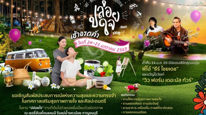 กาญจนบุรี – อีก 3 วัน เชิญเที่ยวปล่อยตัวปล่อยใจไปกับเรา “ปล่อยใจ” Art – Music & Wellness Festival เทศกาลที่รวบรวมงานศิลปะ ดนตรี และการดูแลสุขภาพ มารวมไว้ในที่เดียว เพื่อให้คุณได้ปรนนิบัติทั้งกายและใจไปพร้อมกัน