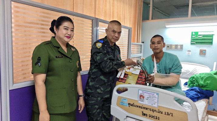กาญจนบุรี – ผู้บังคับการกรมทหารราบเฉพาะกิจที่ 29 พร้อมประธานสมาคมแม่บ้านทหารบก สาขา ร.29 เยี่ยมให้กำลังใจกำลังพลที่ได้รับบาดเจ็บจากการปฏิบัติหน้าที่ชายแดน ไทย – กัมพูชา พร้อมชื่นชมปฏิบัติหน้าที่ด้วยความทุ่มเทเสียสละ